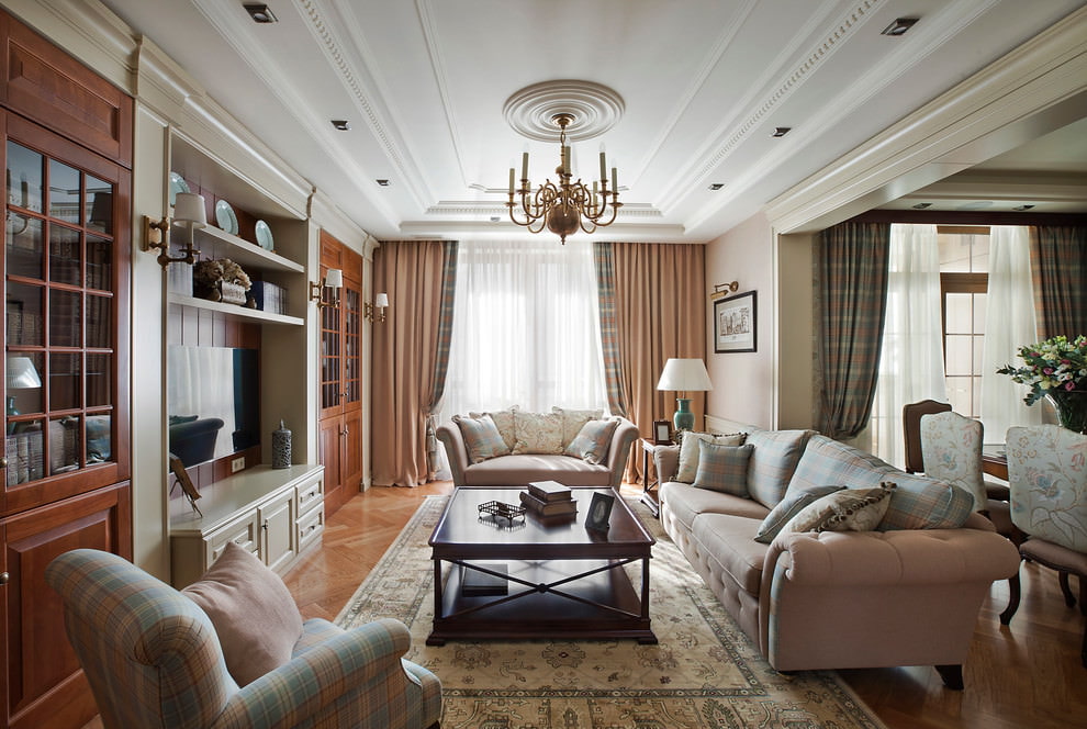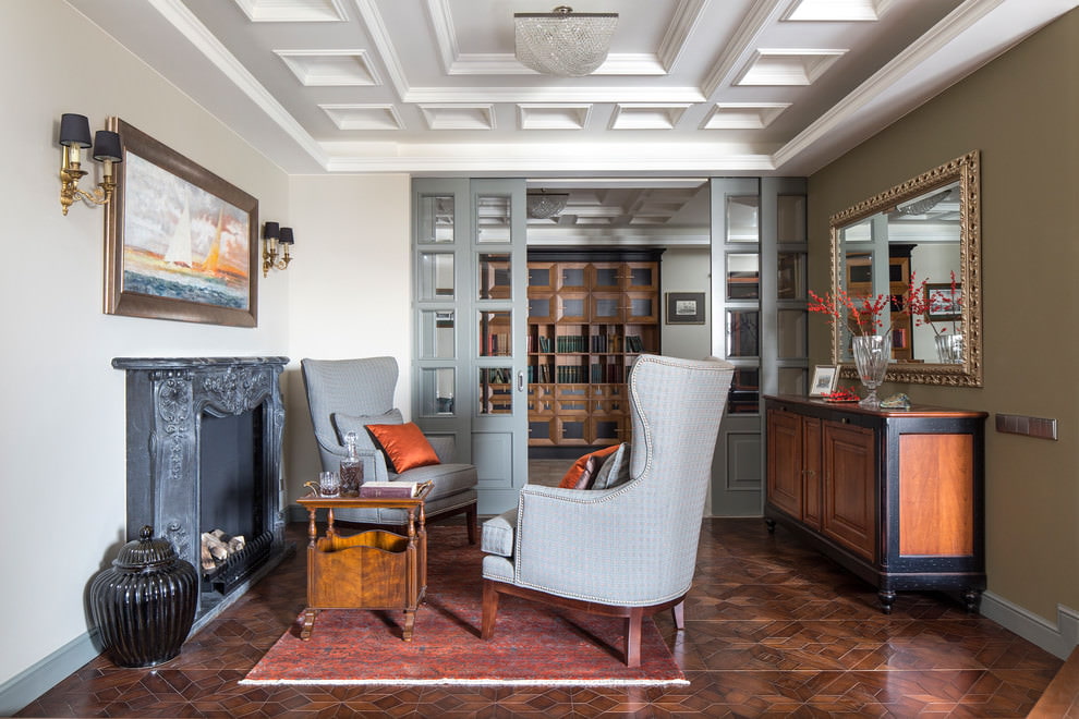 American classics in the interior came along with the resettlement of Old England and the aristocracy. The pairing of furniture, symmetry, light finish, white fireplace, spacious armchairs, classic curtains are important. The lighting is divided into zones and is switched on as needed.