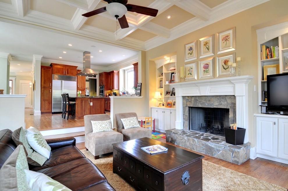 For a living room in an American-style house, a fireplace is suitable, which will remind of family tradition and a hearth of comfort. In a spacious room, you can install a pair of wicker chairs, a bookcase and shelving.