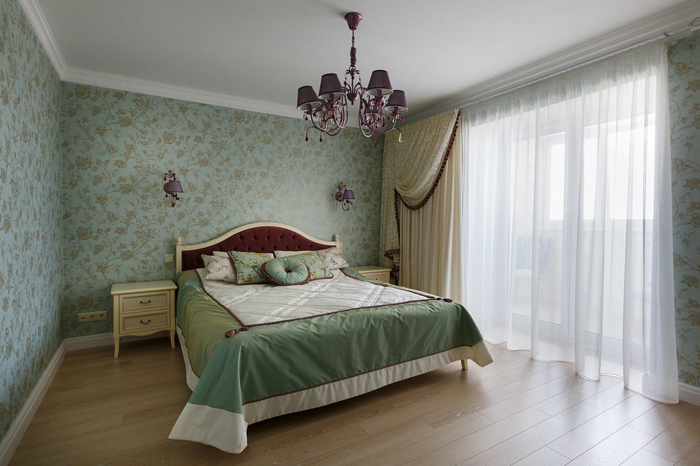 The bed should be of a high classical shape, there must be bedside tables and a chest of drawers. Wood or carpet is suitable for the floor. For decor, panels with a picture and paintings, a triptych, a floor lamp, fresh flowers are suitable.