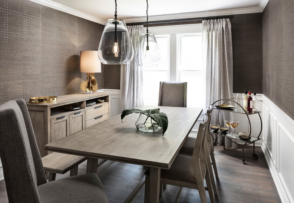 For finishing the kitchen, you should choose anti-vandal wallpaper that does not absorb odors and is easy to clean. Non-woven wallpaper for painting and laminated coverings will be a good option for finishing the dining area, greasy stains will not stick into the surface, and other dirt will be easily washed off.For greater reliability, when finishing the apron area, it is better to use contract or glass wallpaper, they are as resistant to chemicals and mechanical damage as possible.
