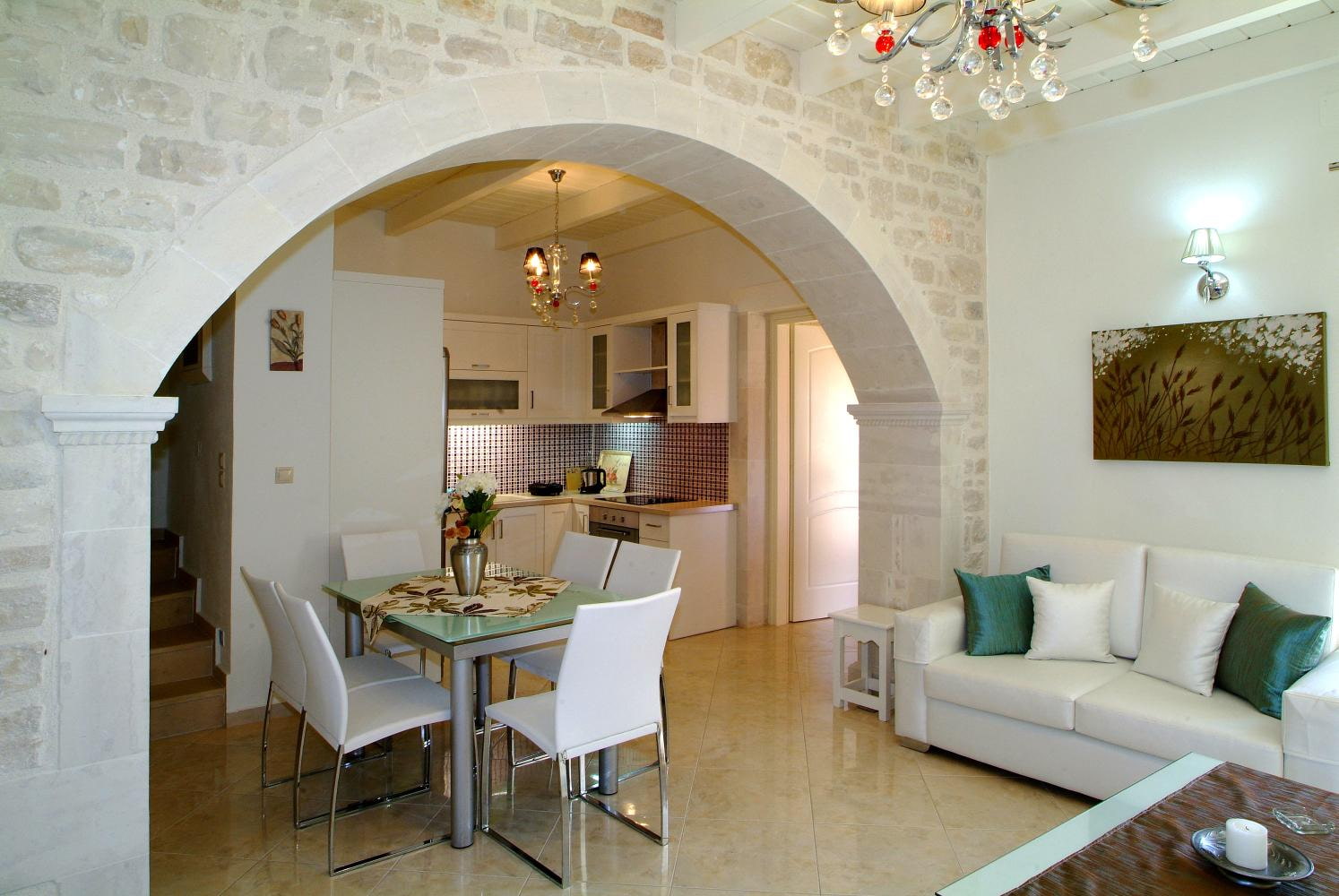 In the photo there is an arch with a rough stone finish that separates the living room and dining area. The furnishings in restrained sandy-brown shades organically combine the natural relief of the stone and perfectly smooth floor and wall coverings.