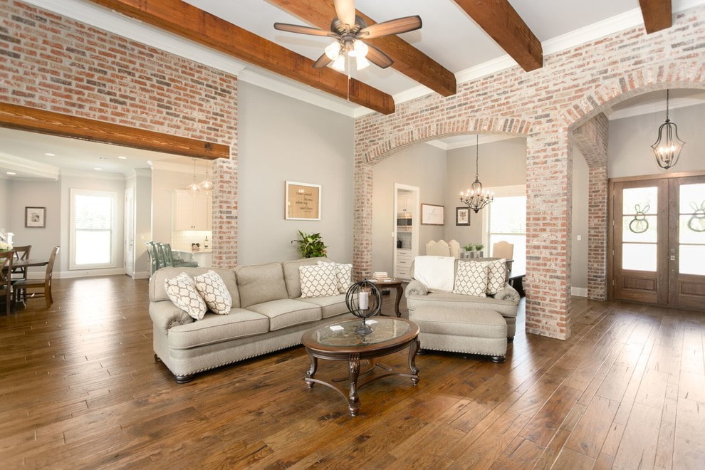 In the photo there is an arch in a Scandinavian-style apartment. The design combines an abrasive brick surface with a varnished wood floor.