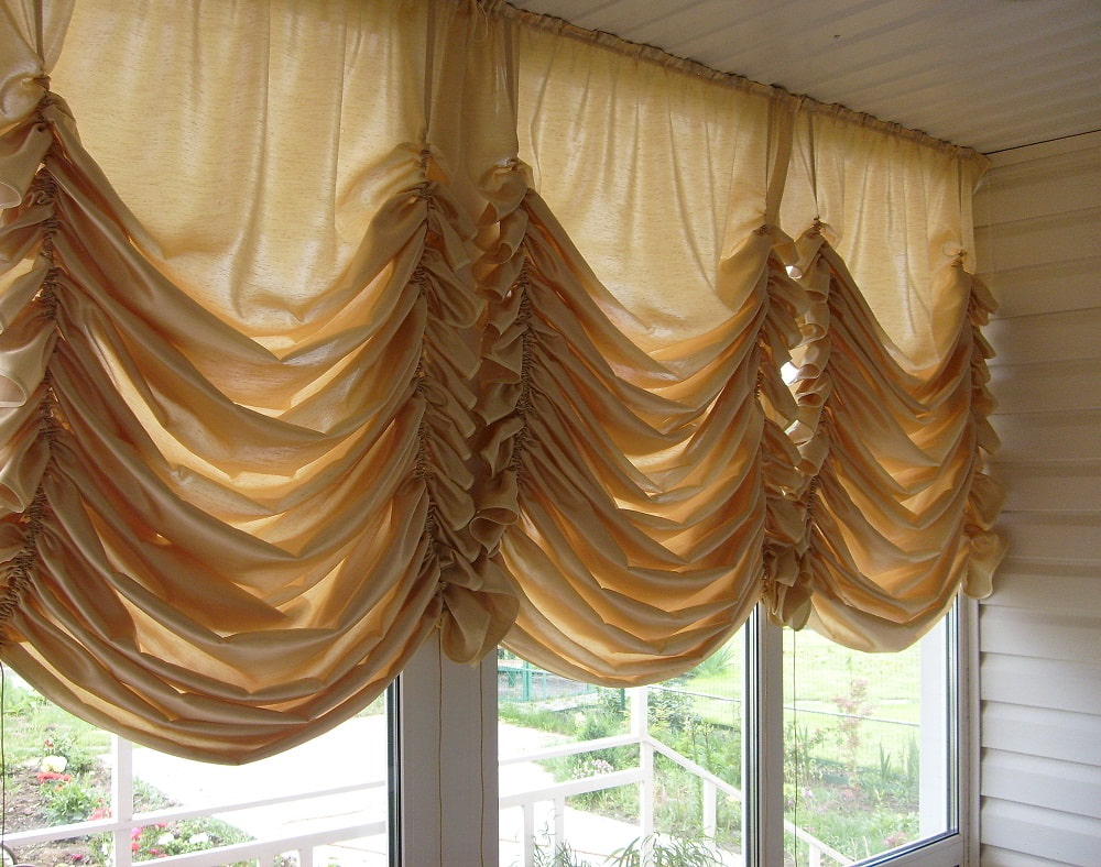 It looks like a combination of Roman and French curtains. Assembly mechanism: when lifted, they are pulled together by cords, due to which body waves and lush folds, called scallops, appear on the canvas.
