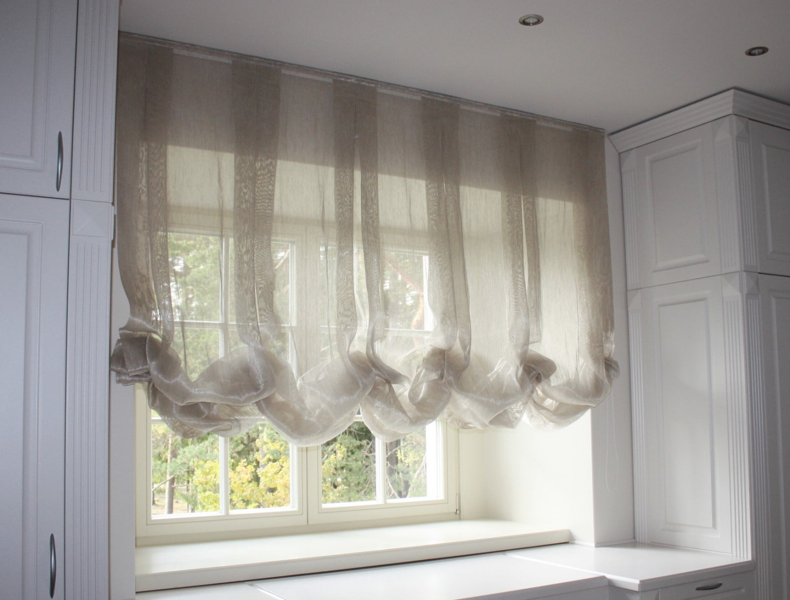 An advantageous option for the kitchen. If the window is near the stove or sink, such curtains save space, since the canvas can be lifted up as much as possible.