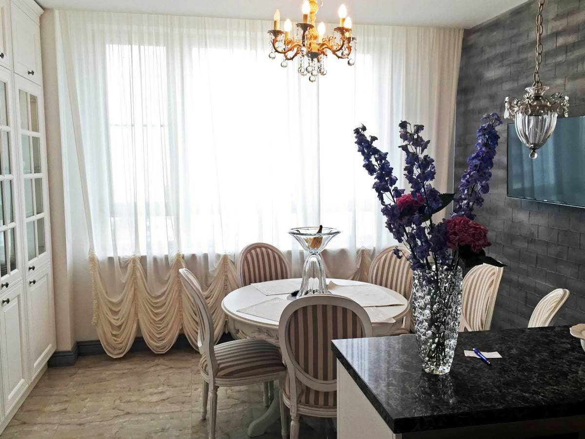 The photo shows the interior of the living room in a modern style with Austrian curtains on the windows.