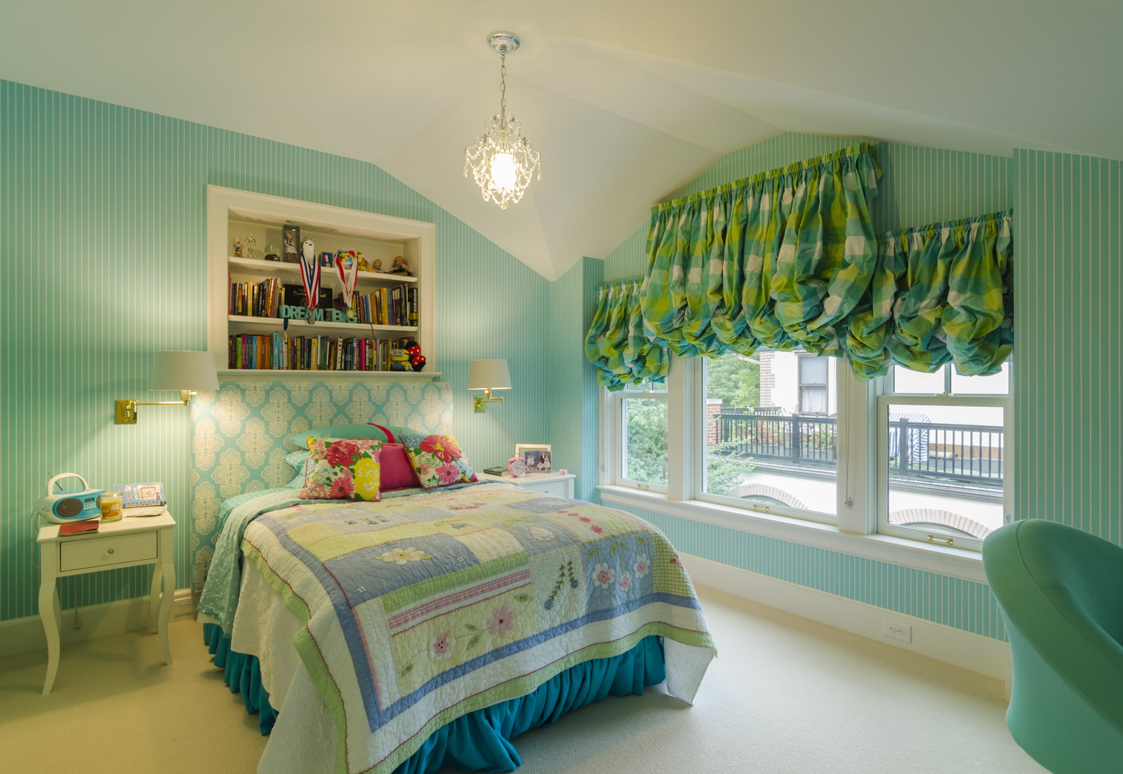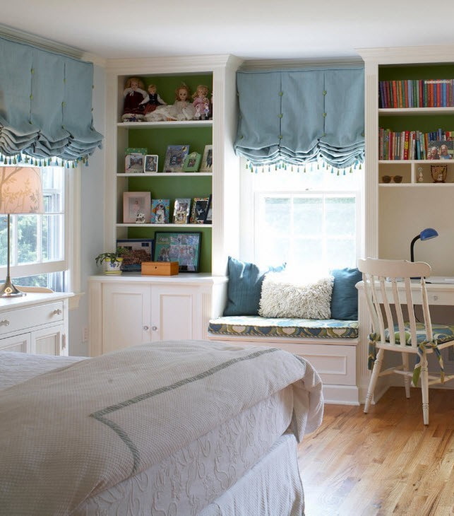 In the photo there is a children's room and a combination of Austrian curtains with blinds on the windows.