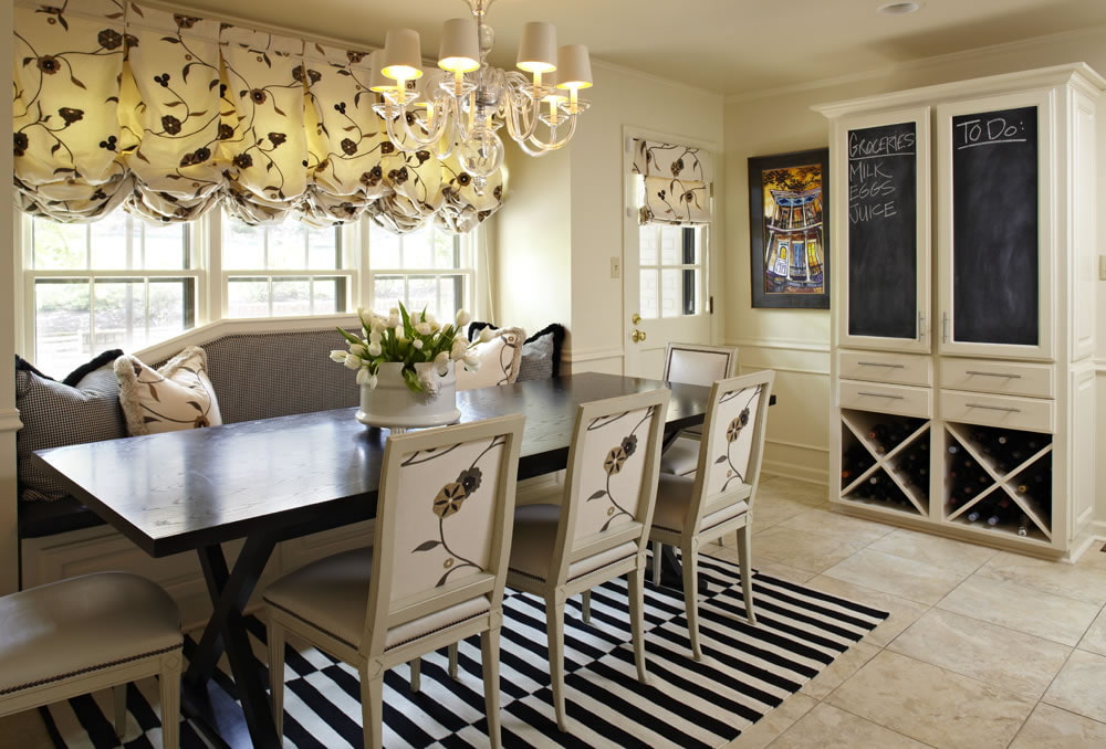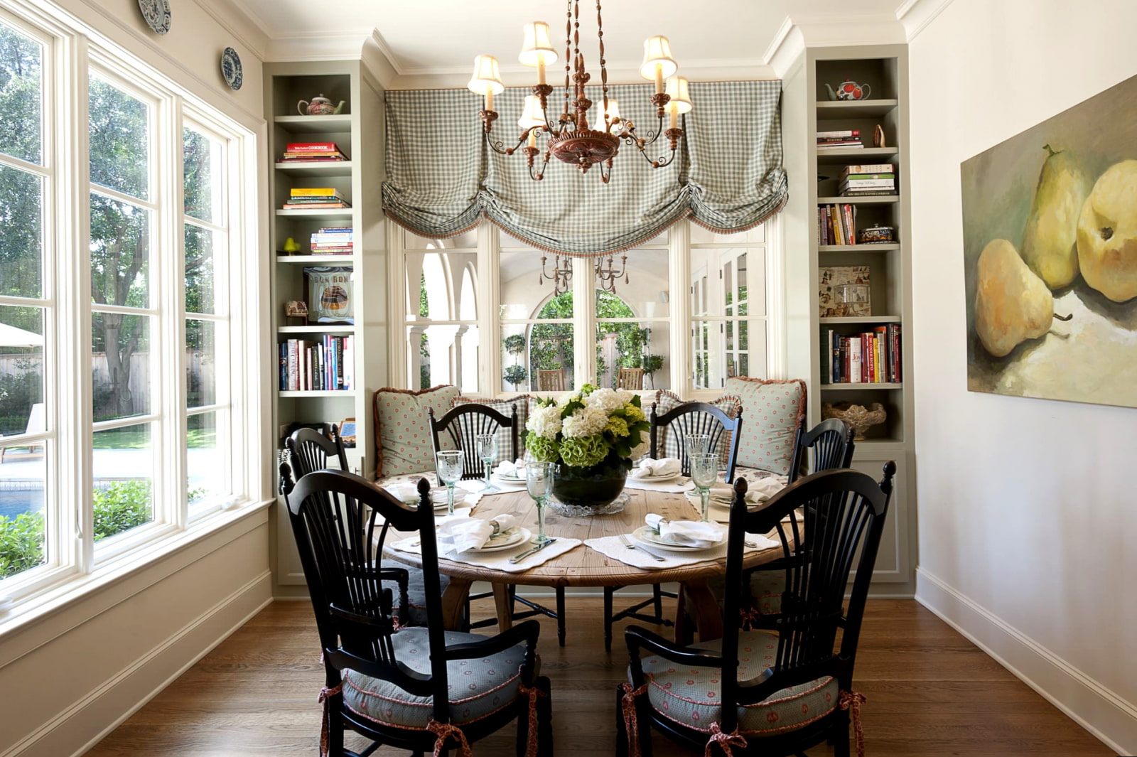 In the photo there is a dining room and a window decorated with Austrian curtains with a floral pattern.