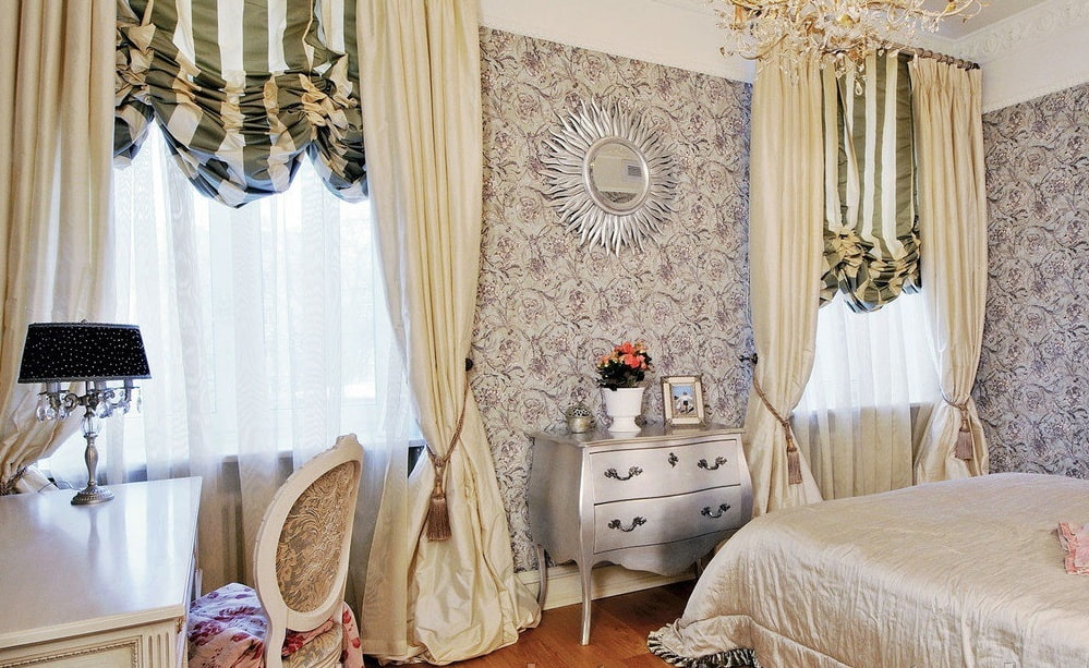 In the photo there are Austrian curtains on the windows in the bedroom in a vintage style.