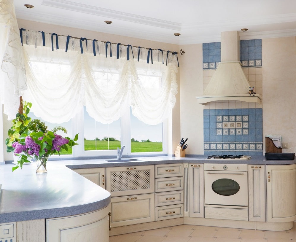 This style is characterized by curtains made of natural fabrics with a slight rustic negligence. Canvases with floral ornaments, striped or checkered patterns noticeably refresh the atmosphere of the room.