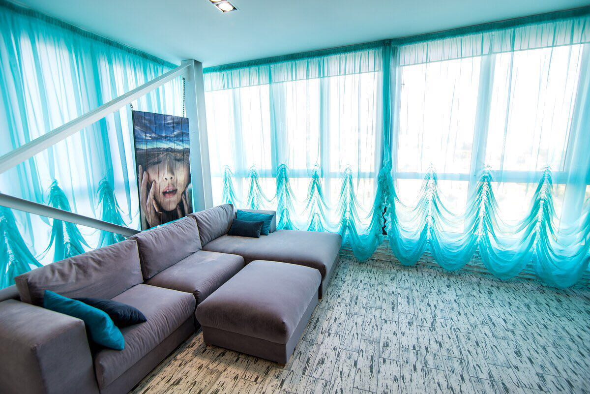 They remind me of a summer breeze. Turquoise Austrian curtains are associated with depth and cleanliness, they breathe cool and freshness.