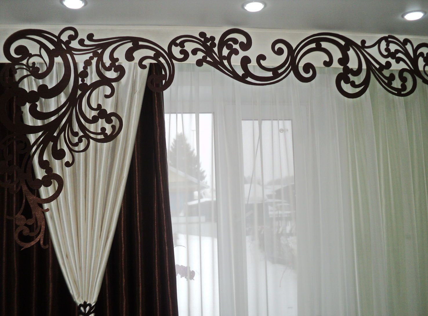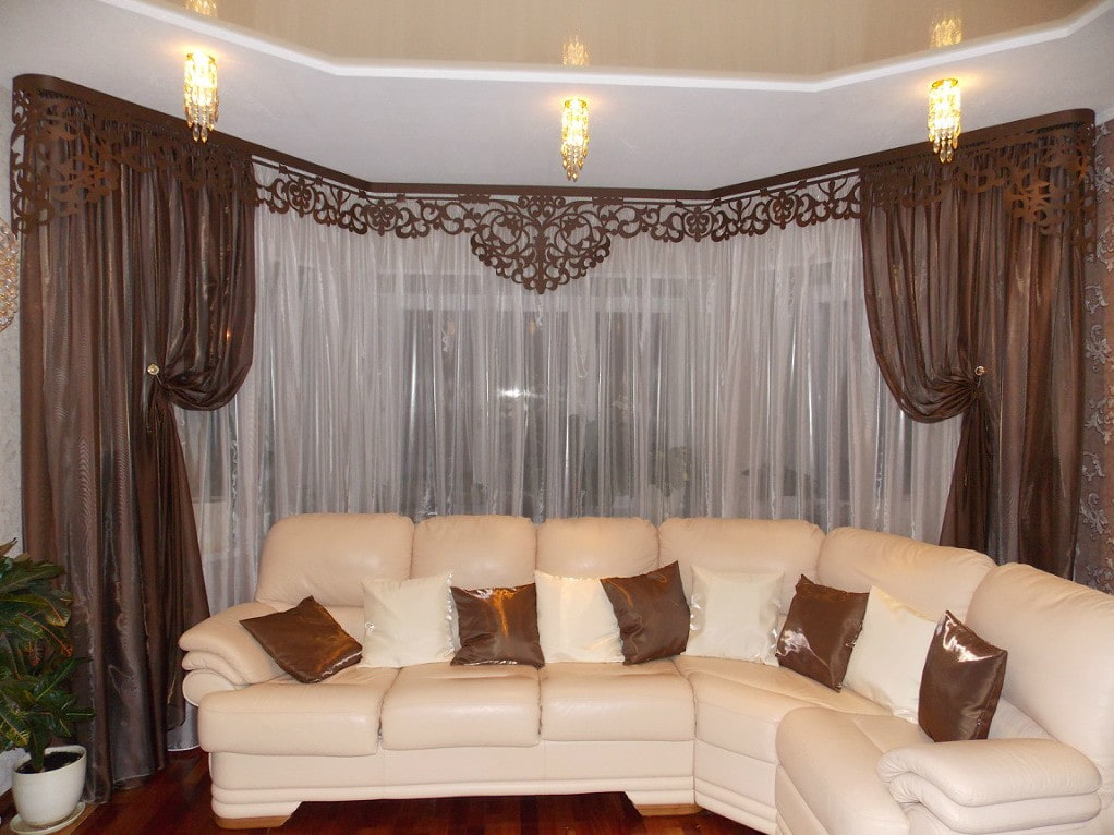 In the photo there is a brown openwork lambrequin in the living room.