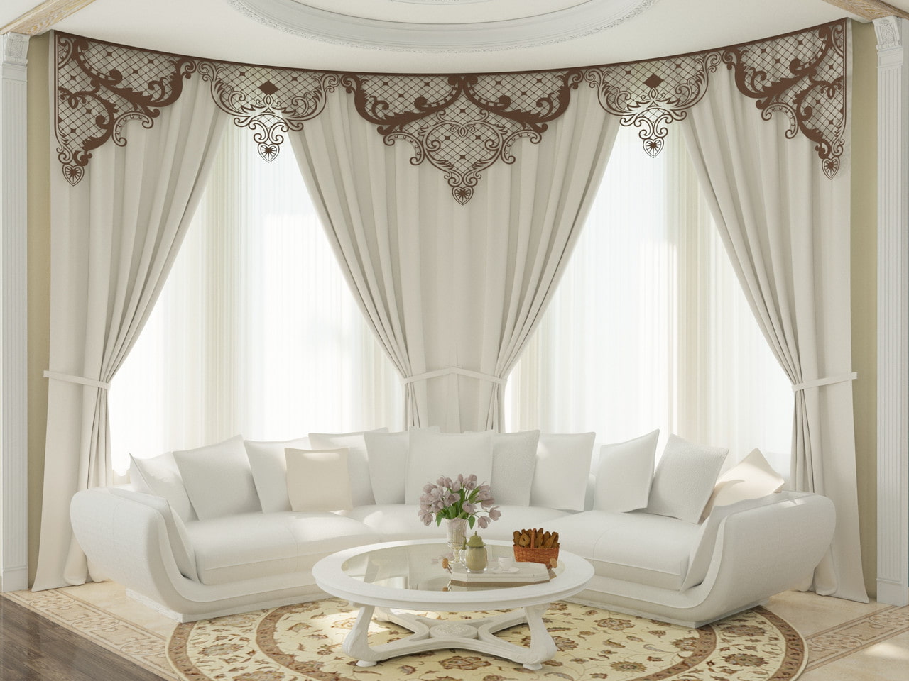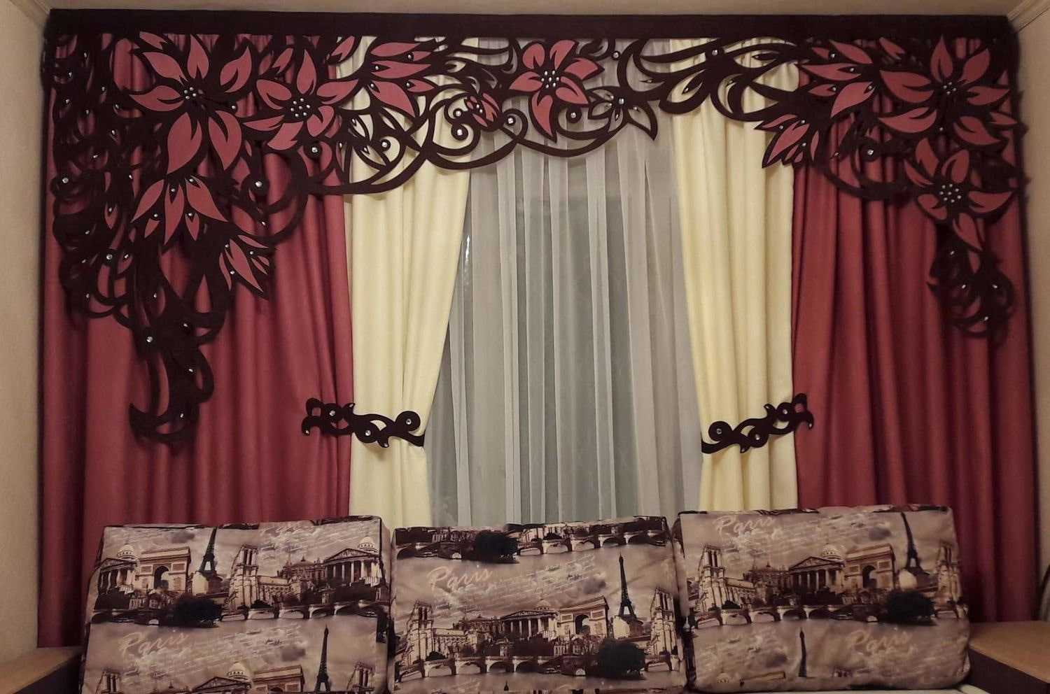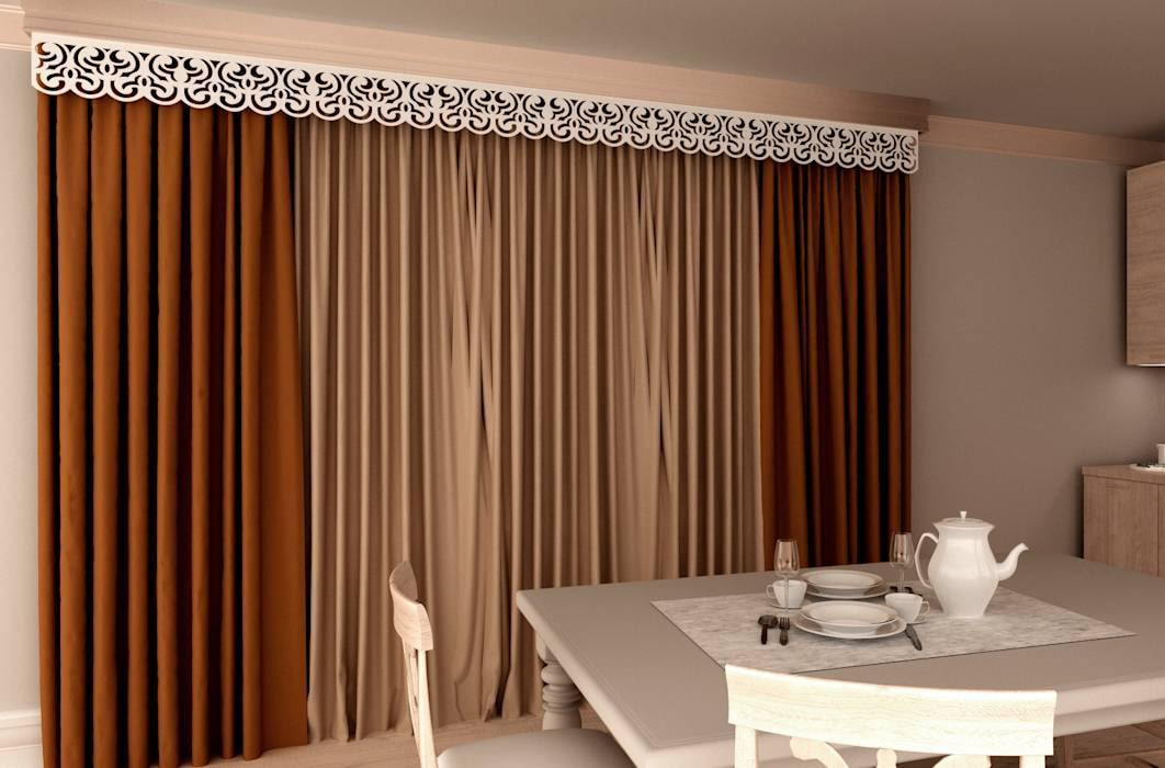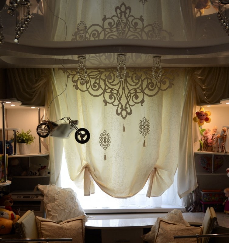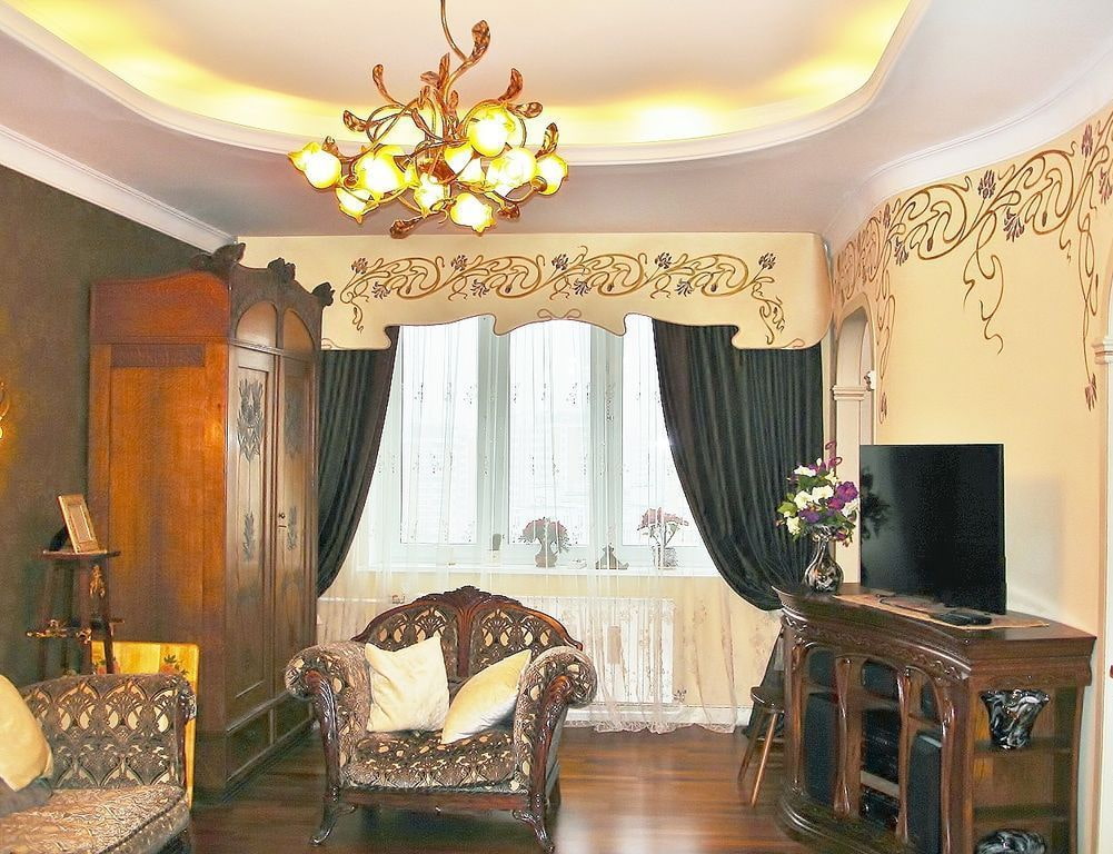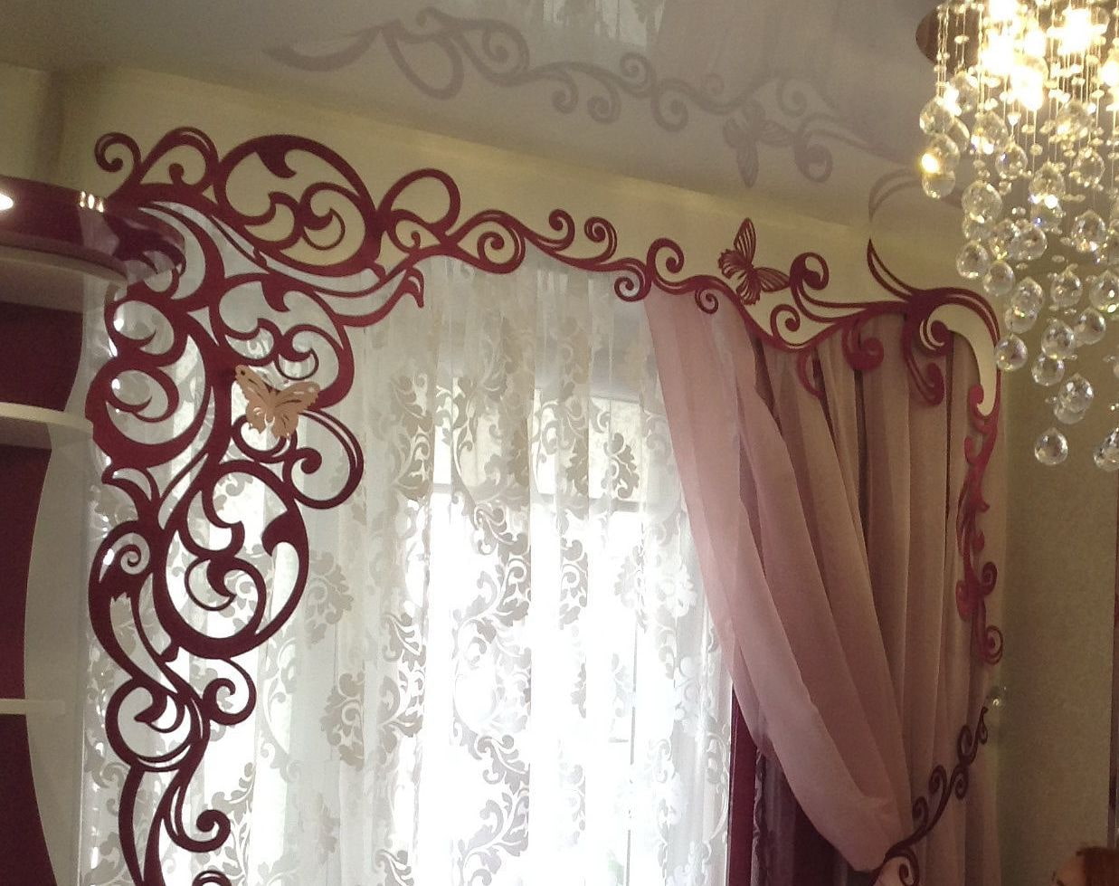 In the living room, carved lace and whimsical compositions look very airy and sophisticated and add elegance to the curtains and the whole room.