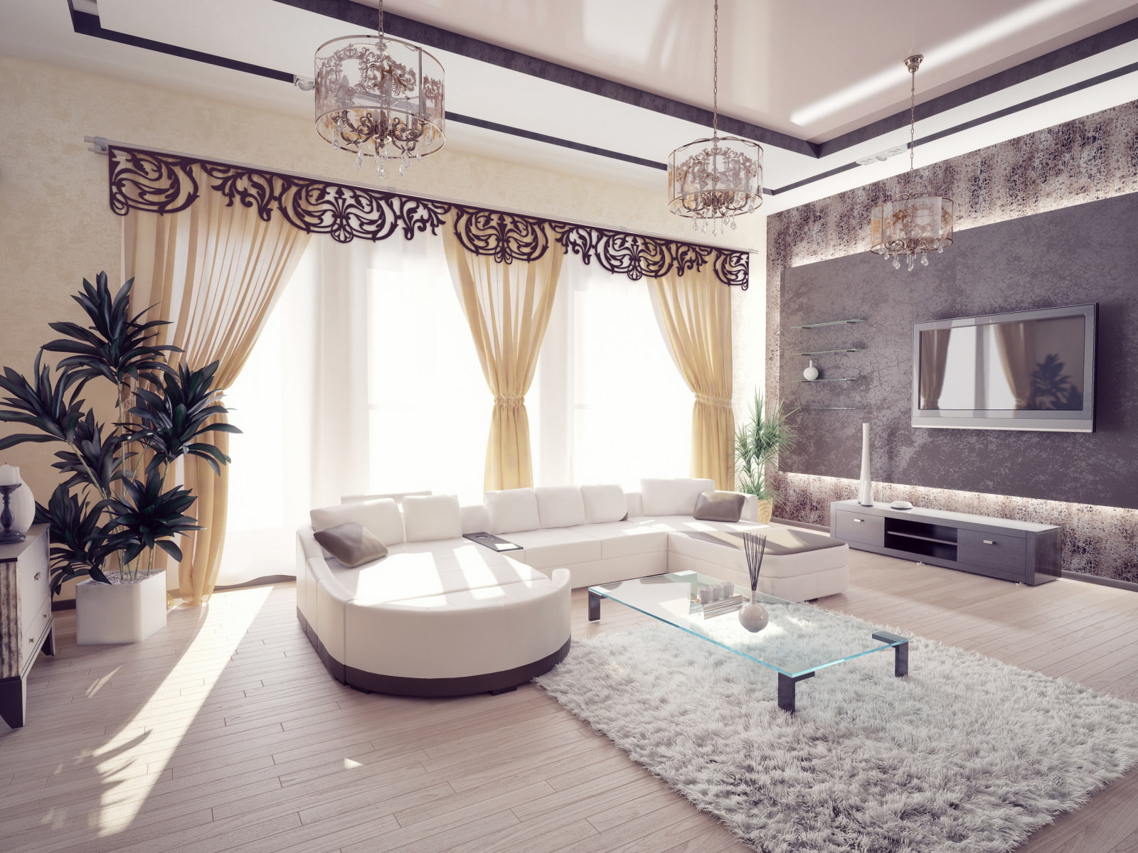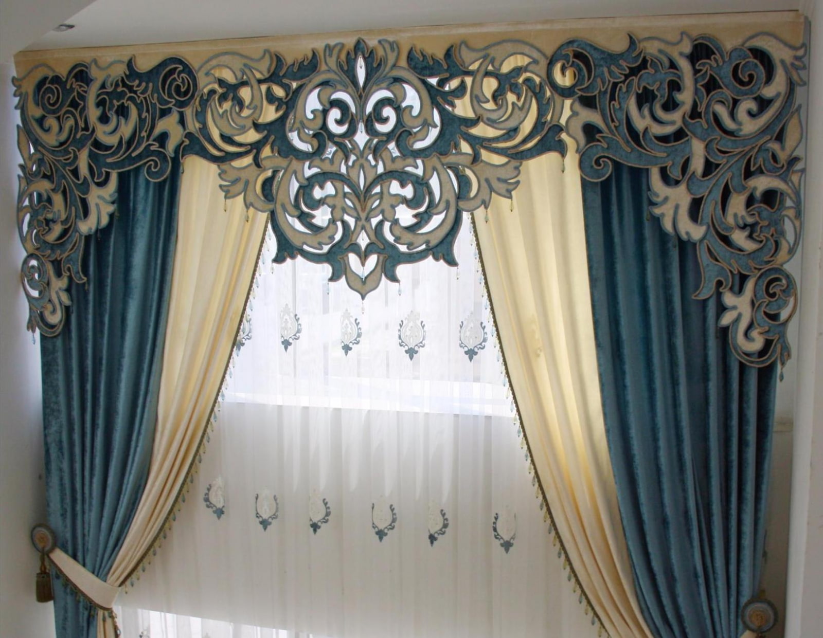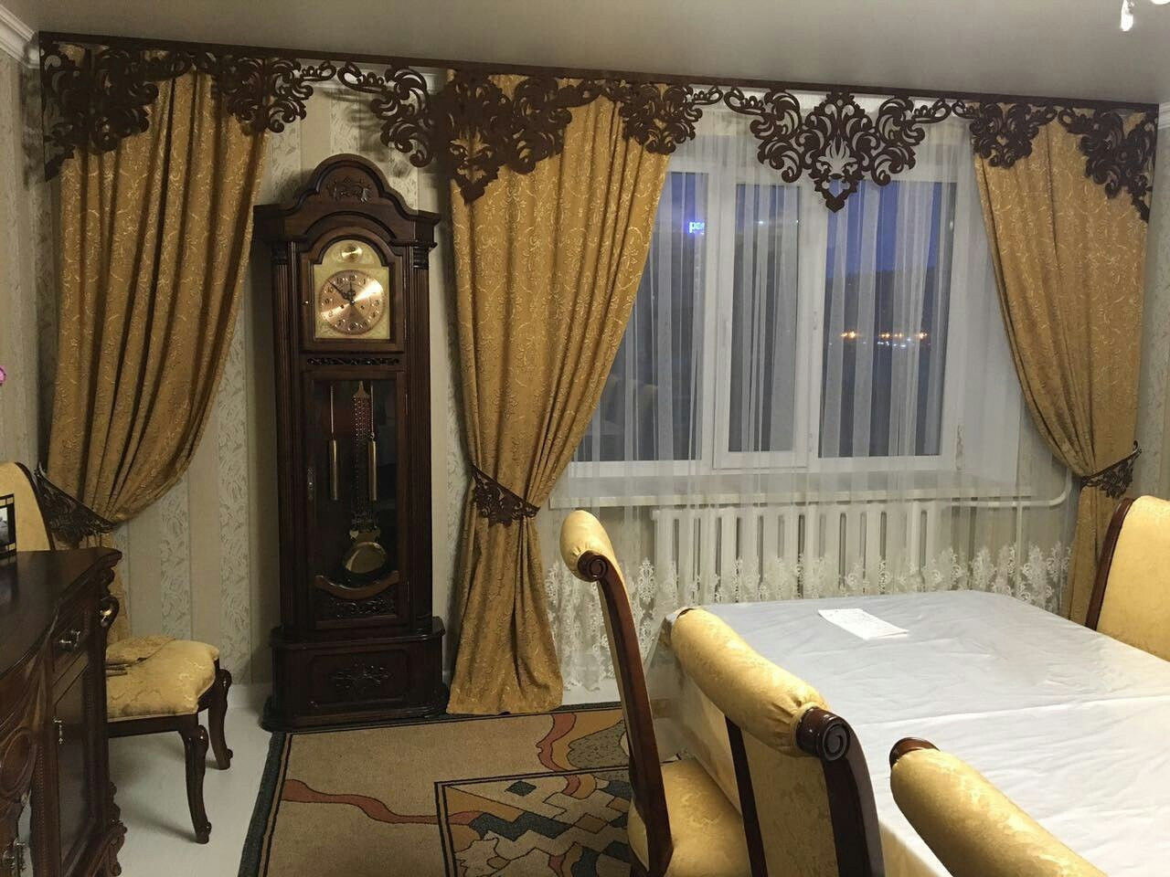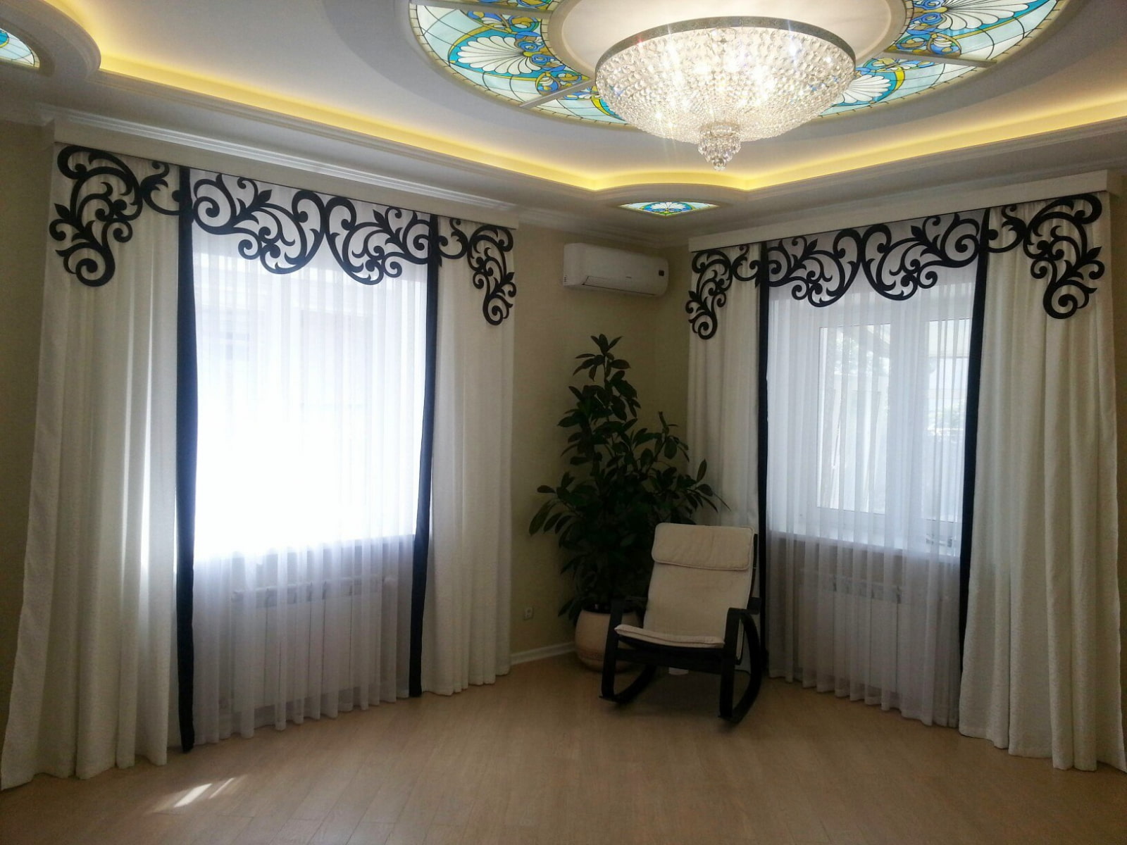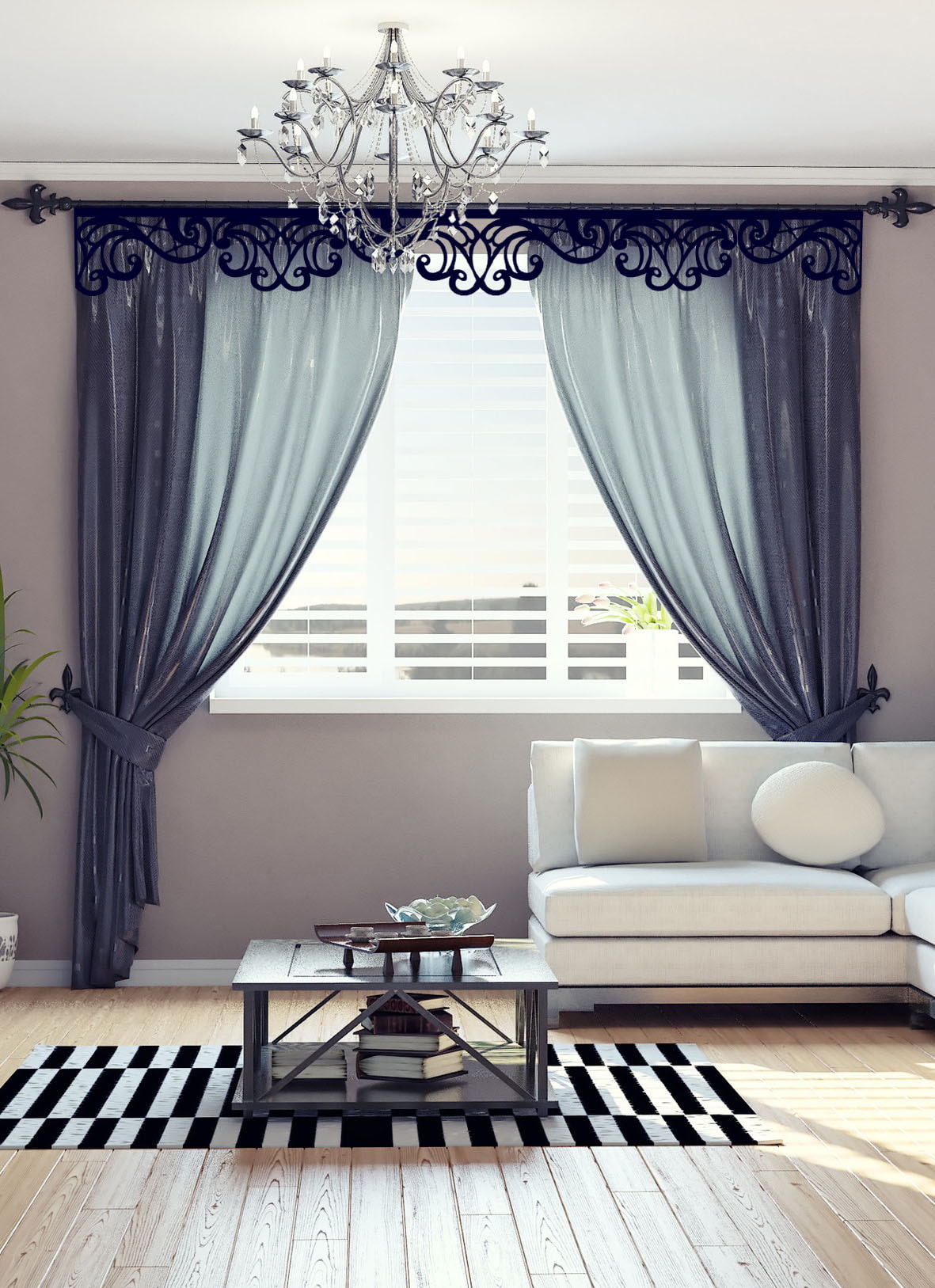 In the living room, carved lace and whimsical compositions look very airy and sophisticated and add elegance to the curtains and the whole room.