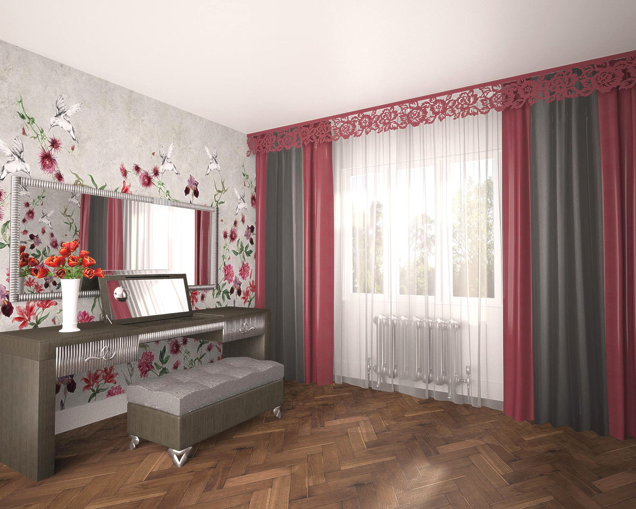 In the photo there is a window opening with an openwork lambrequin in the interior of the bedroom.