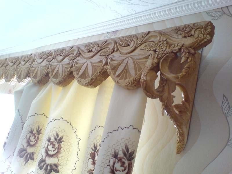 Openwork lambrequins made of wood evoke associations with wooden platbands, which are used to decorate the windows of houses. Products made from such material are quite expensive and will not be appropriate for every interior.