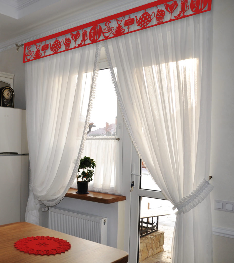 In the photo there is a kitchen and a lath openwork lambrequin on the window.