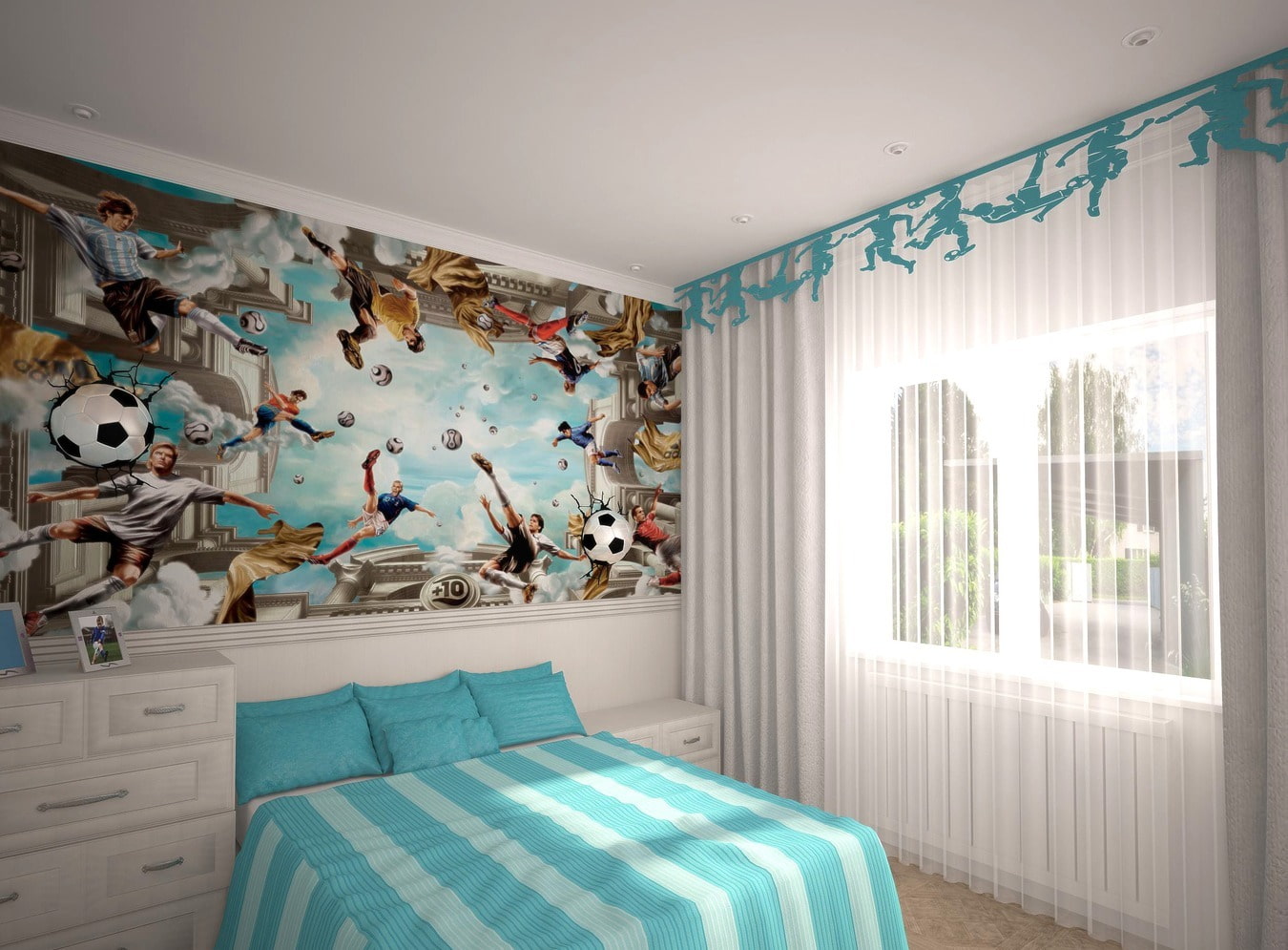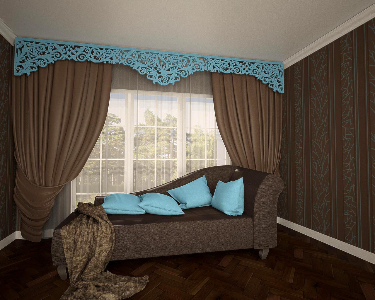 In the photo there is a turquoise openwork lambrequin in the bedroom.