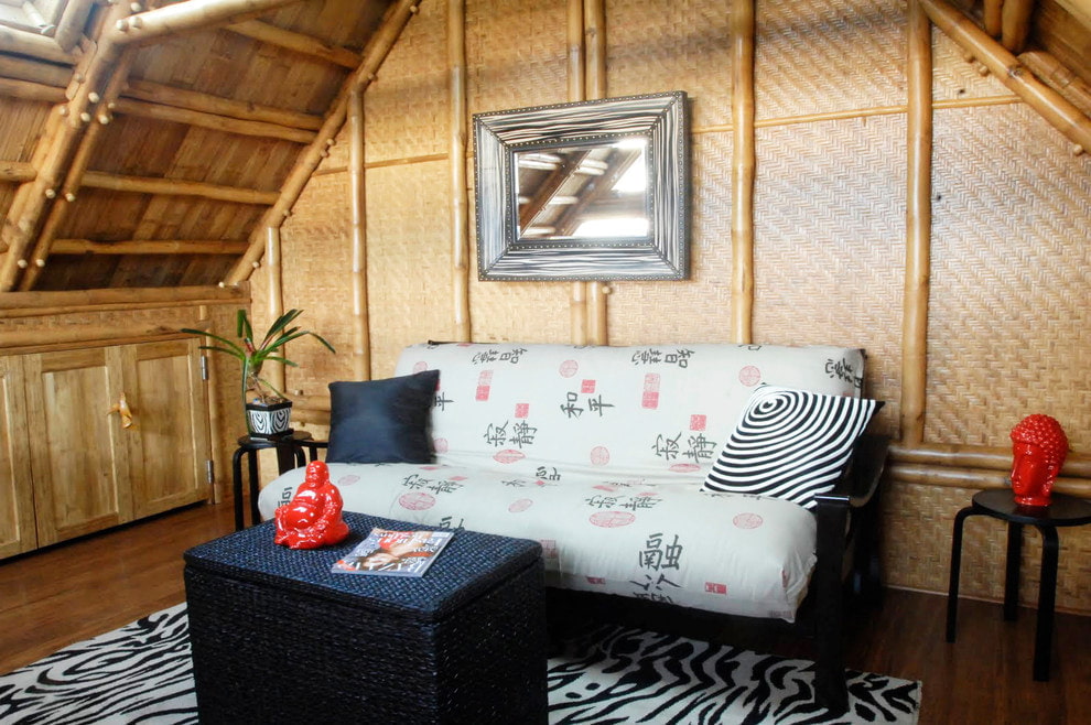 Ethnic motives in the interior of the house have a special mystery and charm. Ethno-design is suitable for decorating a bedroom or living room. Any shade of bamboo will look harmonious in combination with ethnic pieces of furniture, for example, with African motives, unusual decor and dim lighting.