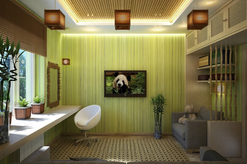 Decorating the ceiling with bamboo wallpaper will create the atmosphere of a tropical house. High ceilings can be complemented by wood beams or a ceiling fan. If the room does not have high ceilings and has standard dimensions, but the bamboo covering can be combined with a stretch or suspended ceiling of a light shade.
