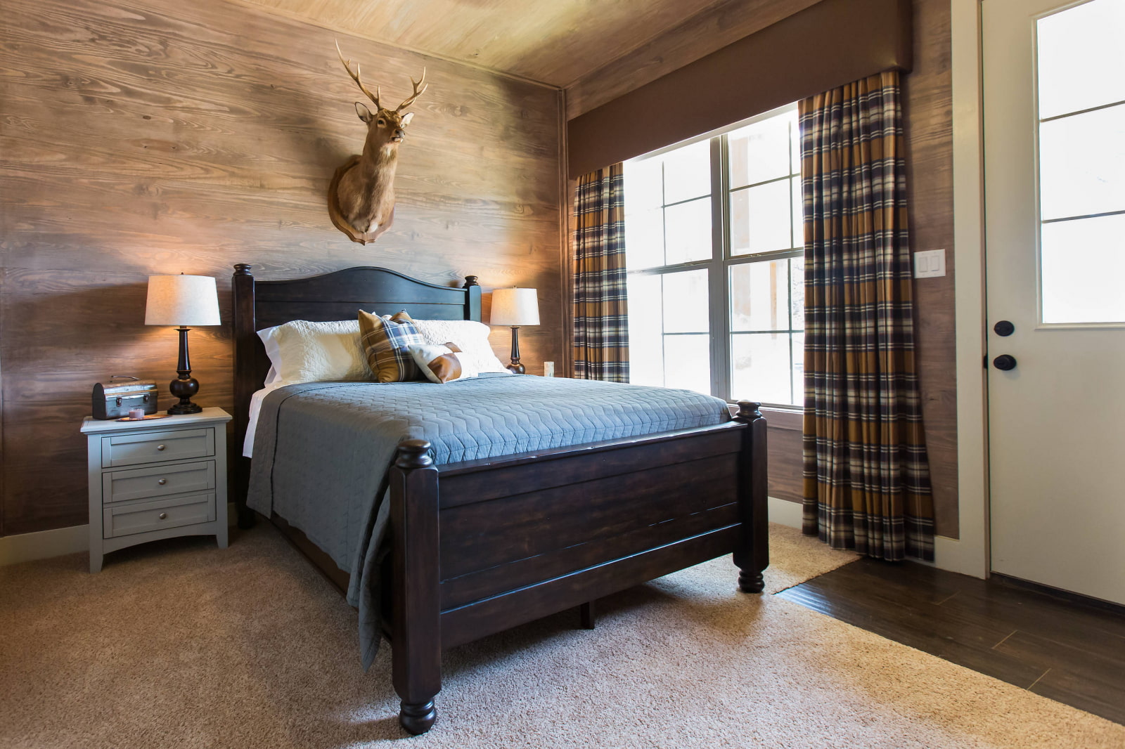 In the photo, a bedroom decorated in rustic style and a brown bandeau with checkered curtains perfectly complements the interior.