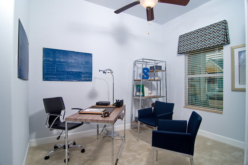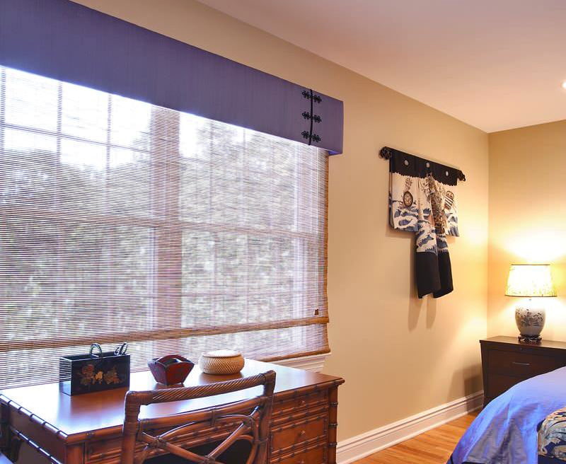 In the photo there is an office and a hard lambrequin with blinds on the window.