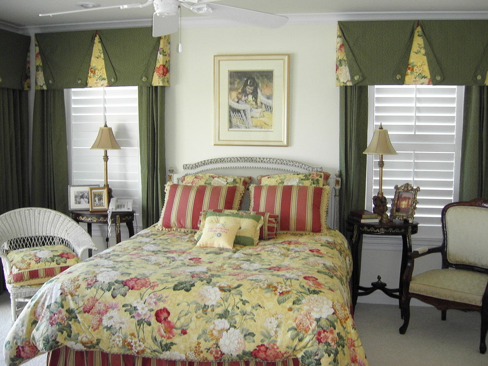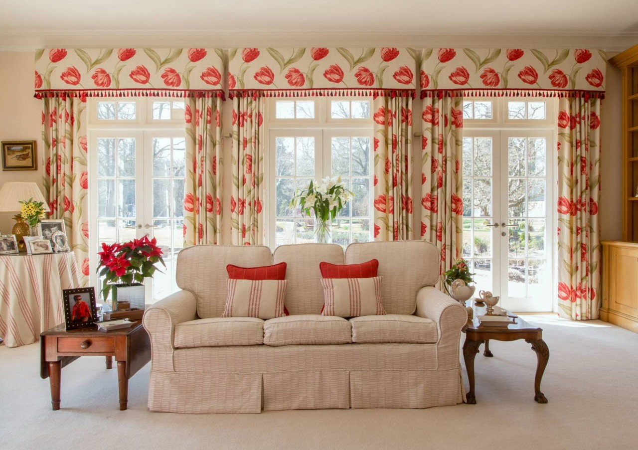 Rich fabrics such as silk, velvet or brocade will be especially appropriate here. The windows are decorated with bandos with intricate damask patterns and lots of decorative additions such as tassels or fringes.
