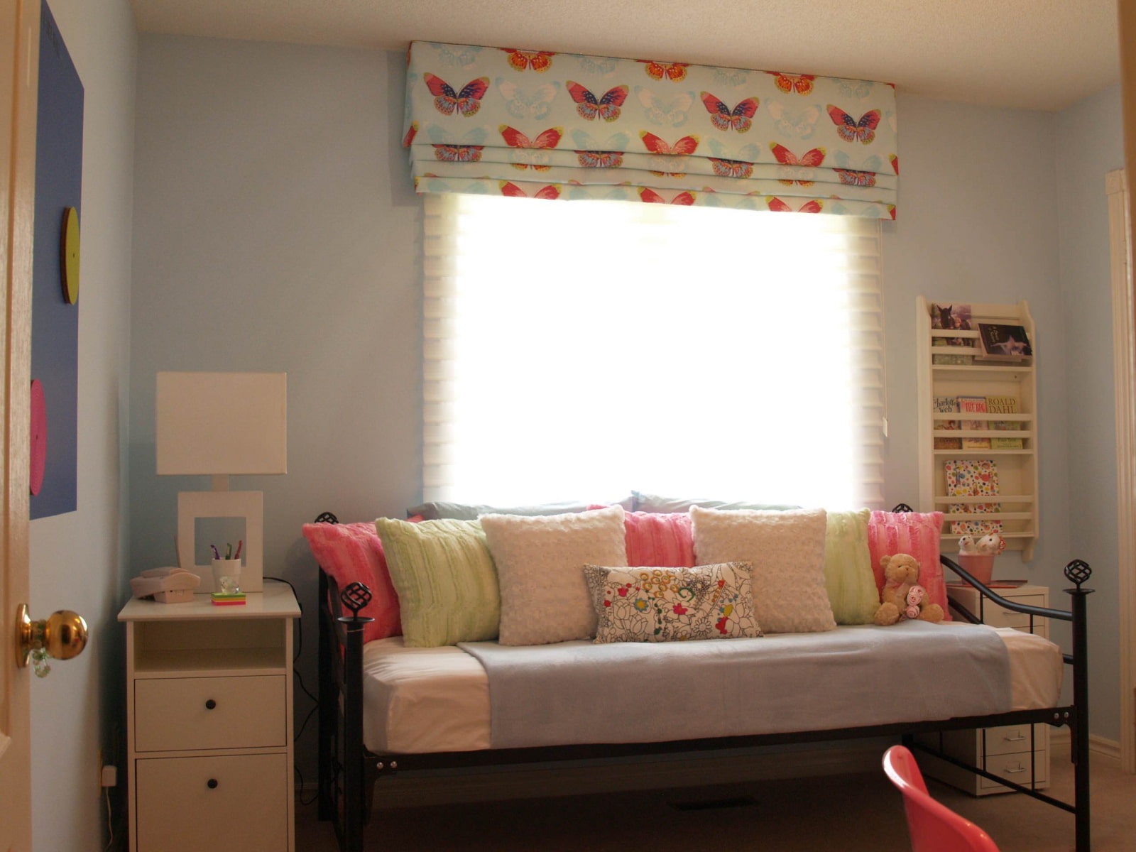 In the photo there is a children's room in the style of minimalism and a window with a white bandeau for curtains.