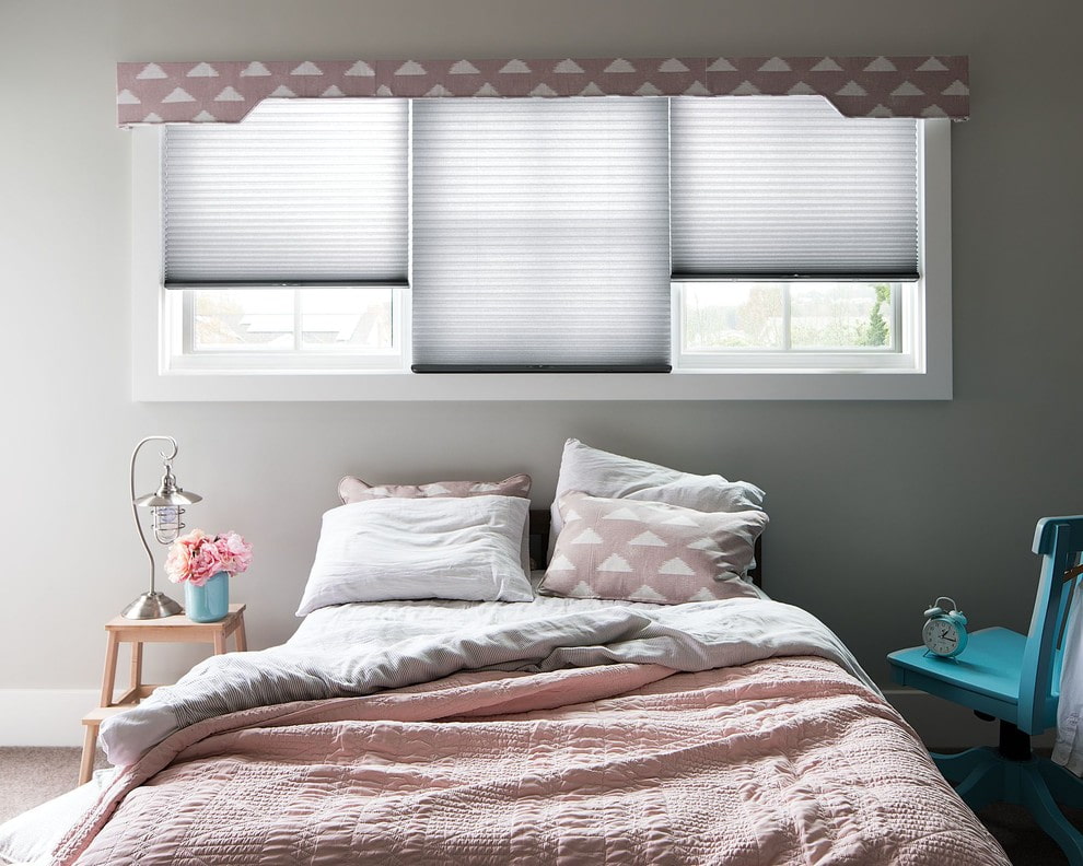 The photo shows the interior of the bedroom and the bandeau for curtains with a geometric pattern in the form of squares.