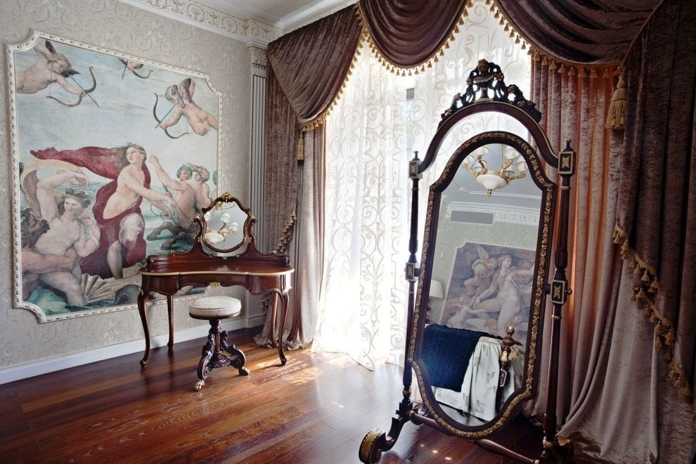 Long velvet curtains that lie on the floor, decorated with hooks, fringes, bugles, mother-of-pearl, pom-poms, lambrequins or tassels, are perfect for this style. Such a curtain composition will fit especially perfectly into the interior.