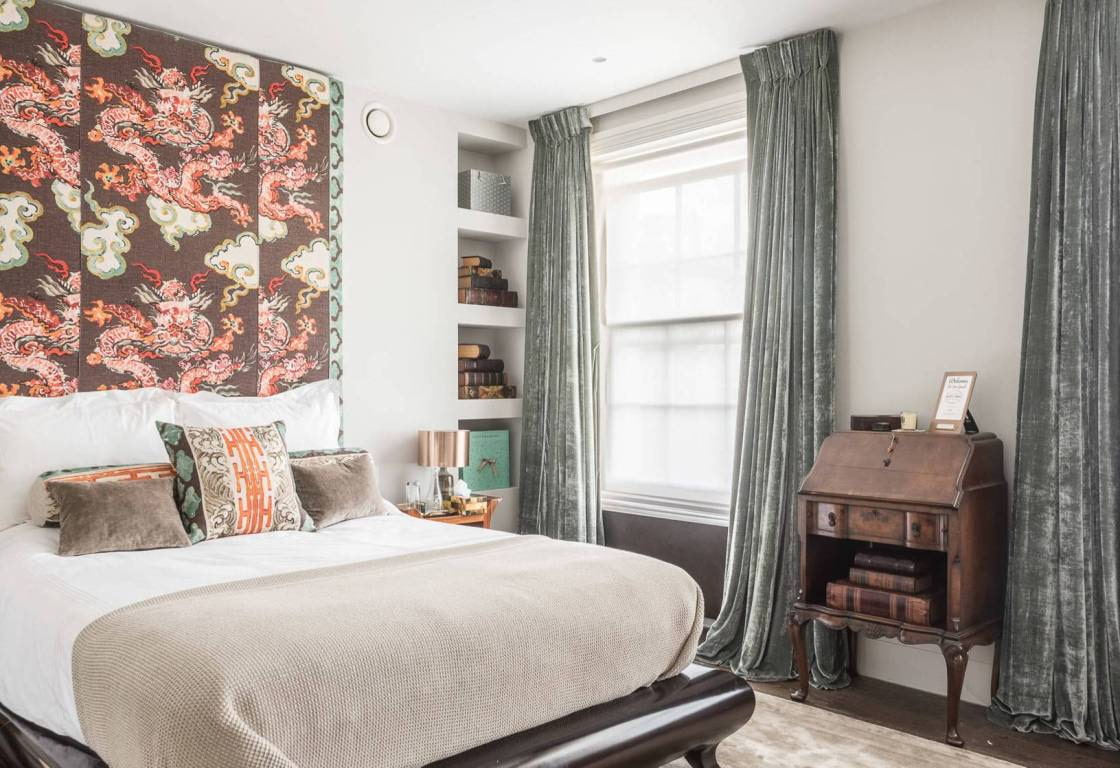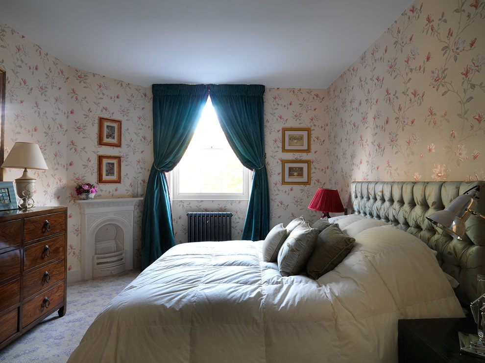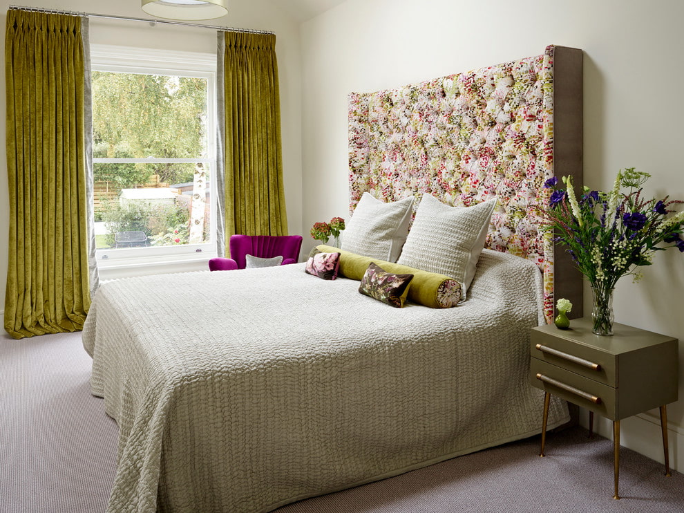 In the photo there are swamp-colored velvet curtains in the interior of the bedroom.
