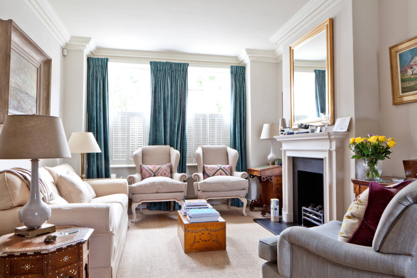 The photo shows the interior of the living room velvet curtains on the windows.