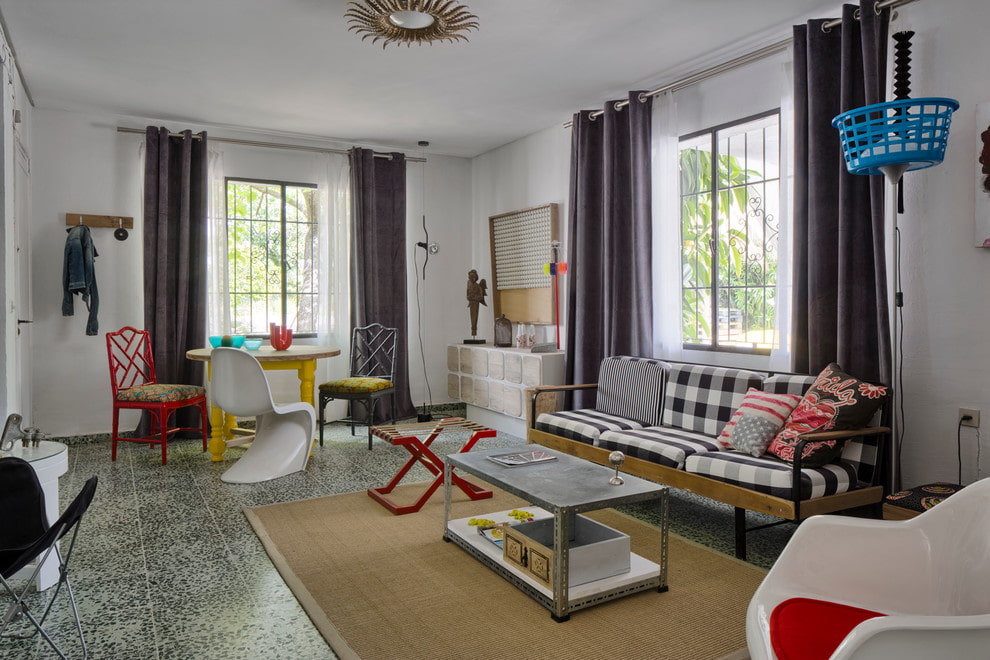 The photo shows a living room in a modern style and black velvet curtains on the windows.