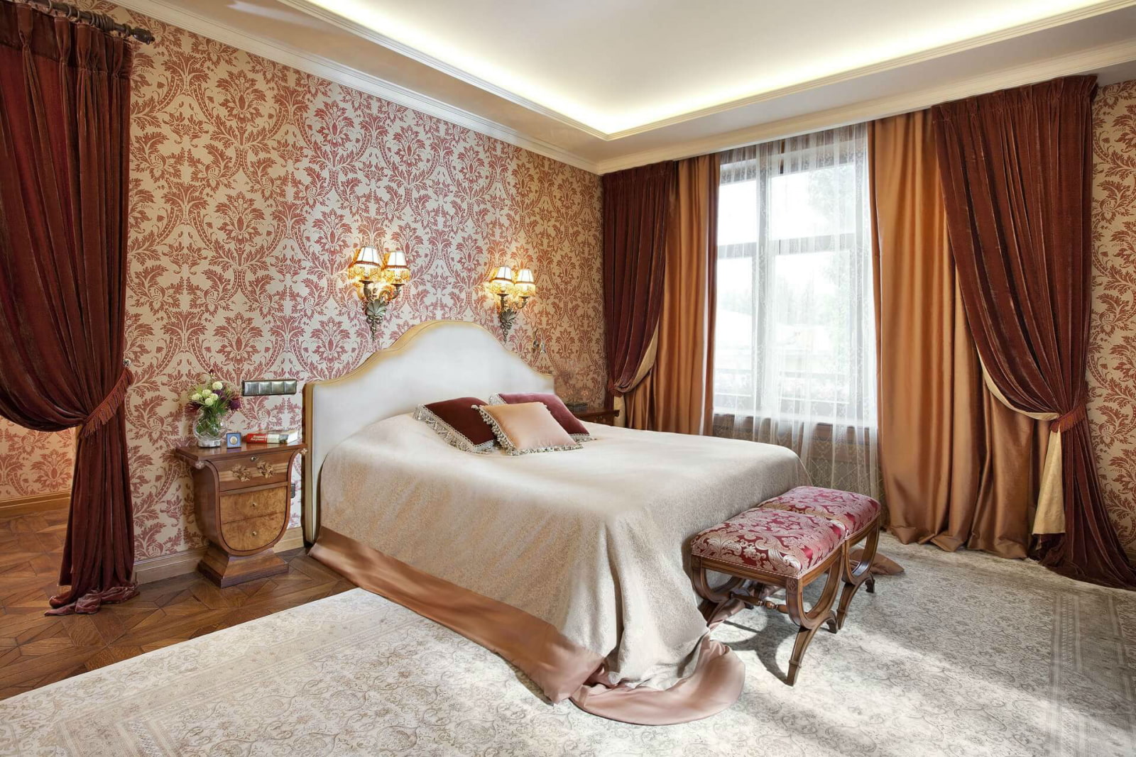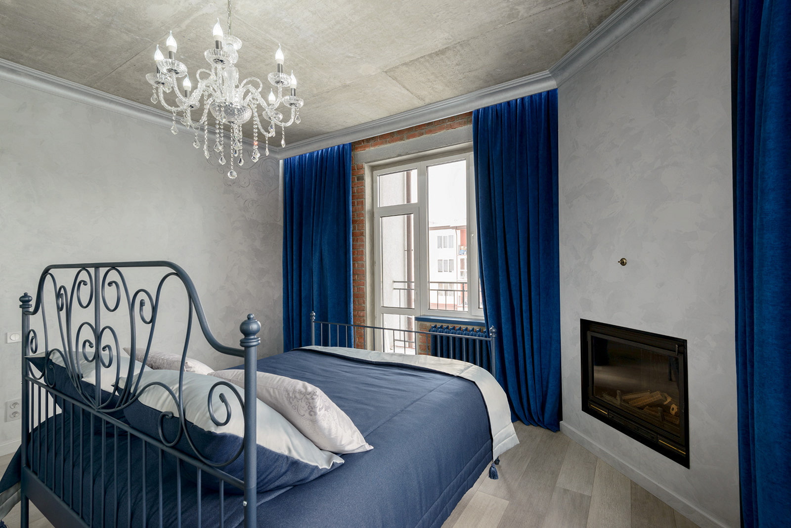 In the photo there are velvet curtains on the window in the interior of the bedroom.