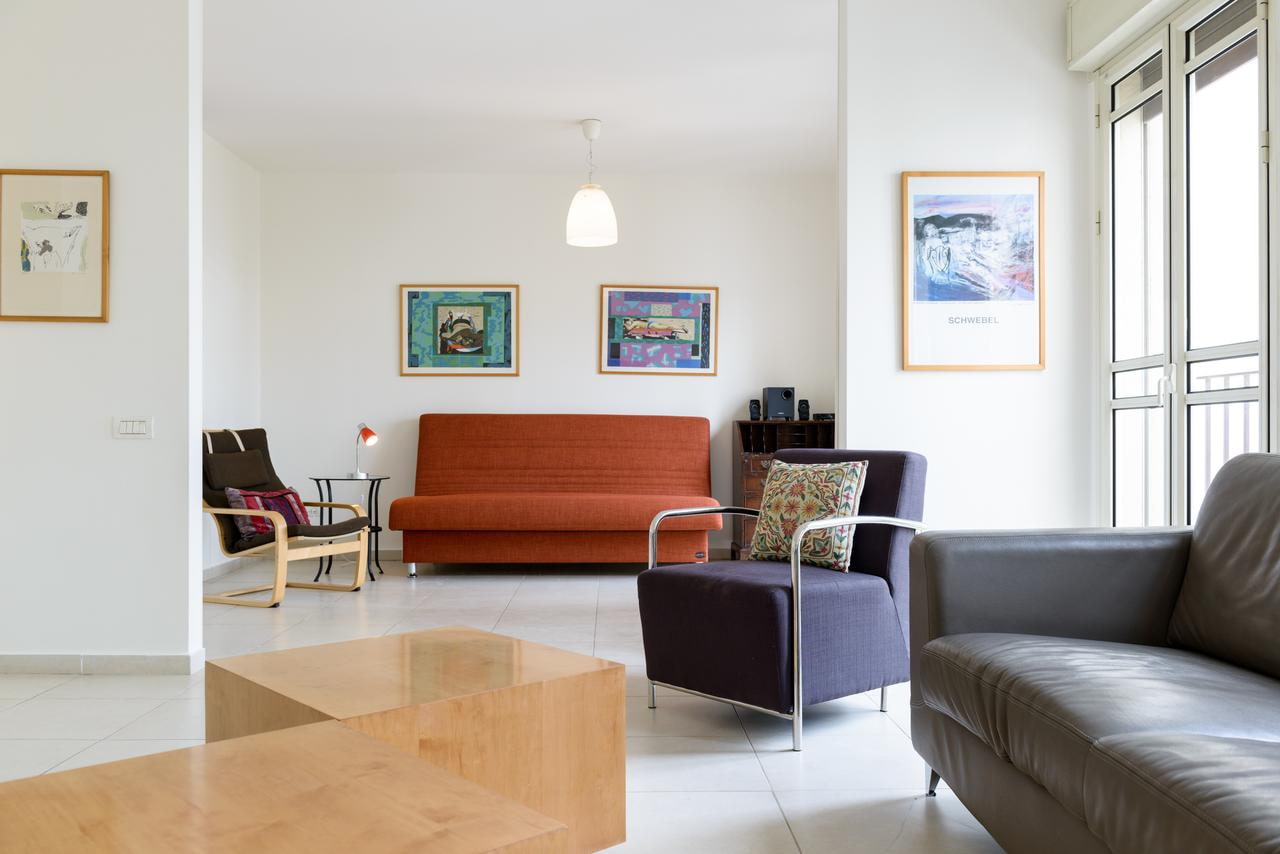 Living room in the Bauhaus style - several comfortable armchairs, a simple coffee table, a console for television equipment.