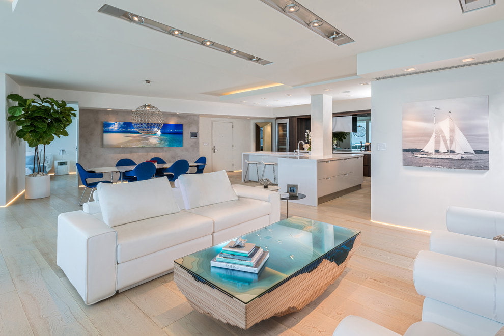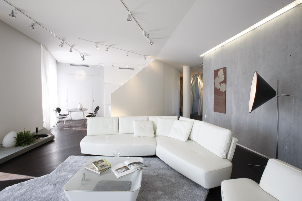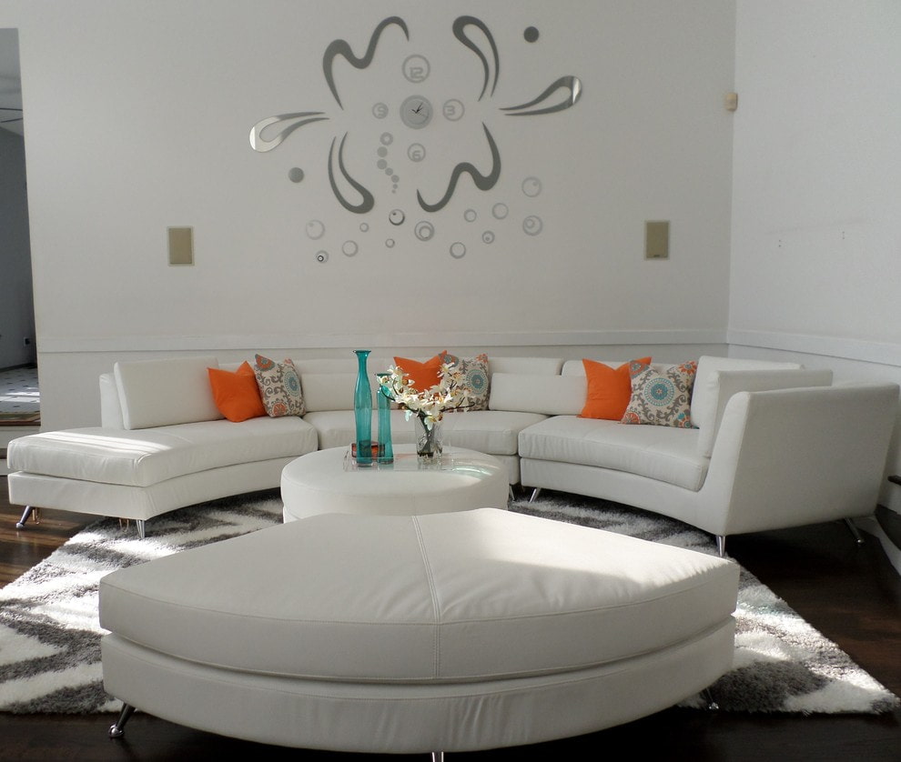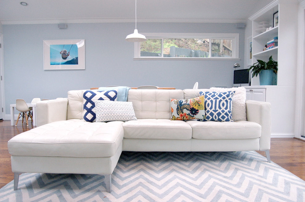 In the interior of a living room or a spacious hall, a white sofa will look chic and expensive. In a spacious room, the classic straight model can be complemented by a group of armchairs or an ottoman. A white round or modular sofa will look interesting.