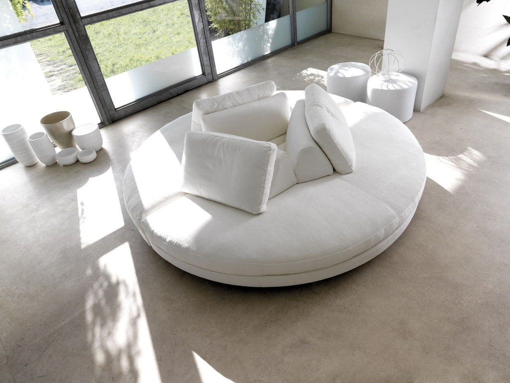 A round sofa will attract attention and become an unusual idea for interior decoration. The model is suitable for modern design. Unused corners can be considered a minus if the sofa will stand along the wall.