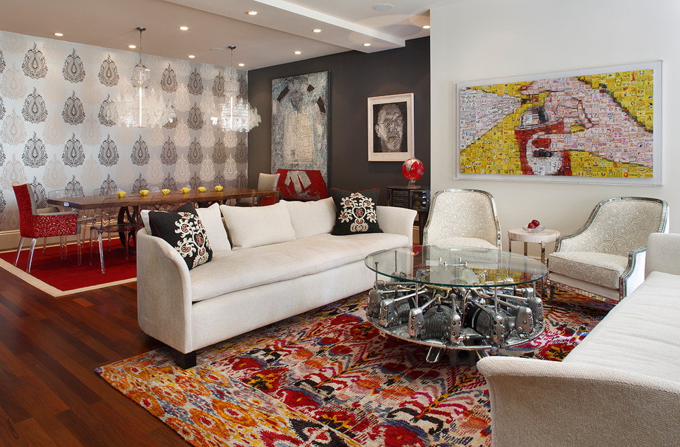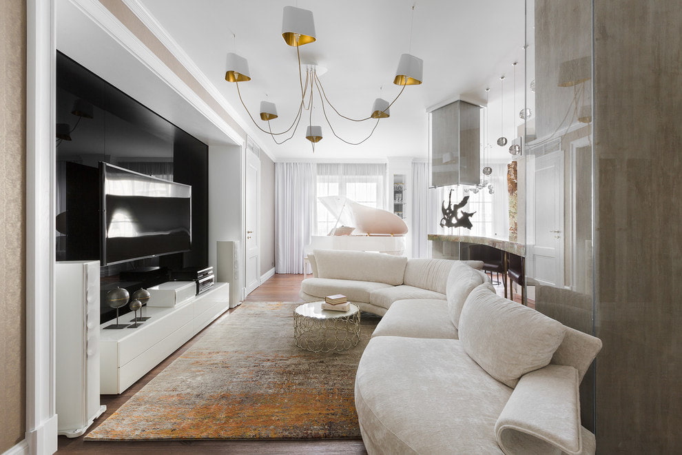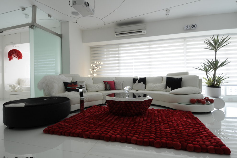 You can add color to your room design with a rug. In the classical hall, a carpet with a short pile and a beautiful pattern will look harmonious; for a modern interior, you can use a carpet with a long pile. The colors can repeat the shade of the furniture or contrast against the general background.