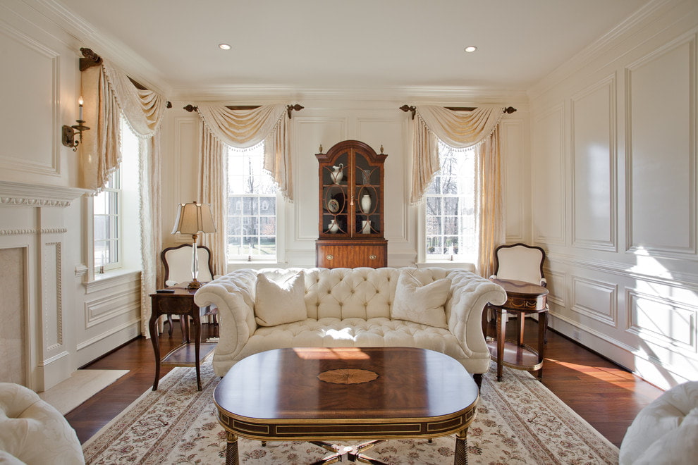 The classic style combines elegance and restraint. A white sofa on legs with flowing shapes can combine several shades, for example, white and milky or blue. Materials for a classic interior should be chosen natural, wood is beautifully combined with white upholstery. Pillows or rivets can be used as decor.