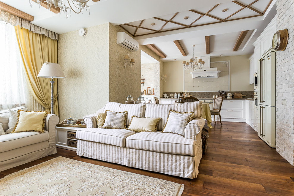 A gentle romantic destination with a touch of antiquity and rustic coziness. Wooden elements may have scuffs, this will only emphasize the beauty of Provence. White upholstery can be combined with pastel shades or floral patterns. Several sofa cushions will complete the picture.