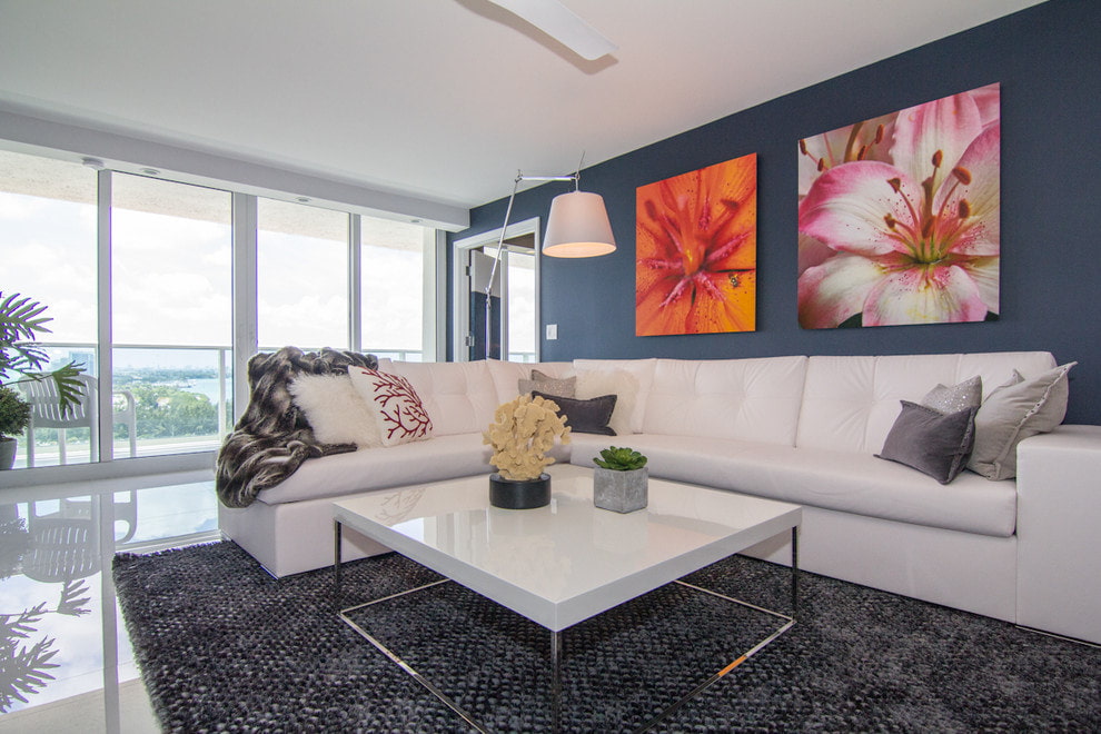 White is beautiful for its ability to create a successful duet with any shade. Against the background of dark walls, the white sofa will seem even brighter, in this case it would be a good idea to add a few more light details to the interior, such as tulle, decor or furniture.