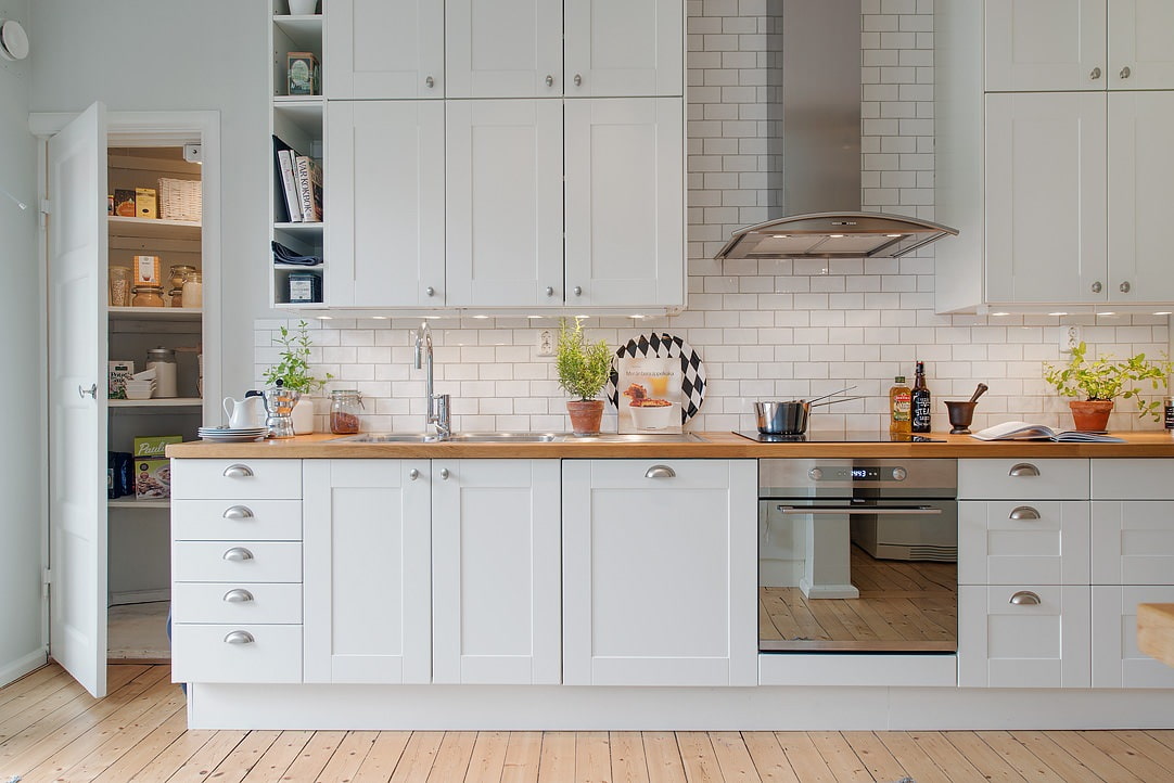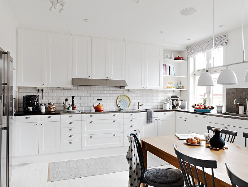 The most common option is a white brick finish for a kitchen apron. In the event that the kitchen is small, and there are wall cabinets, this will be the most successful solution, and it is better to replace the decorative brick with its imitation of tiles - this is more practical.