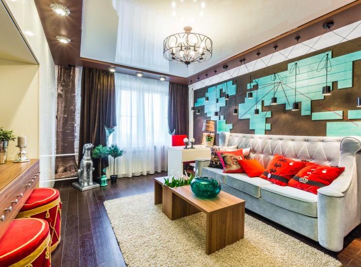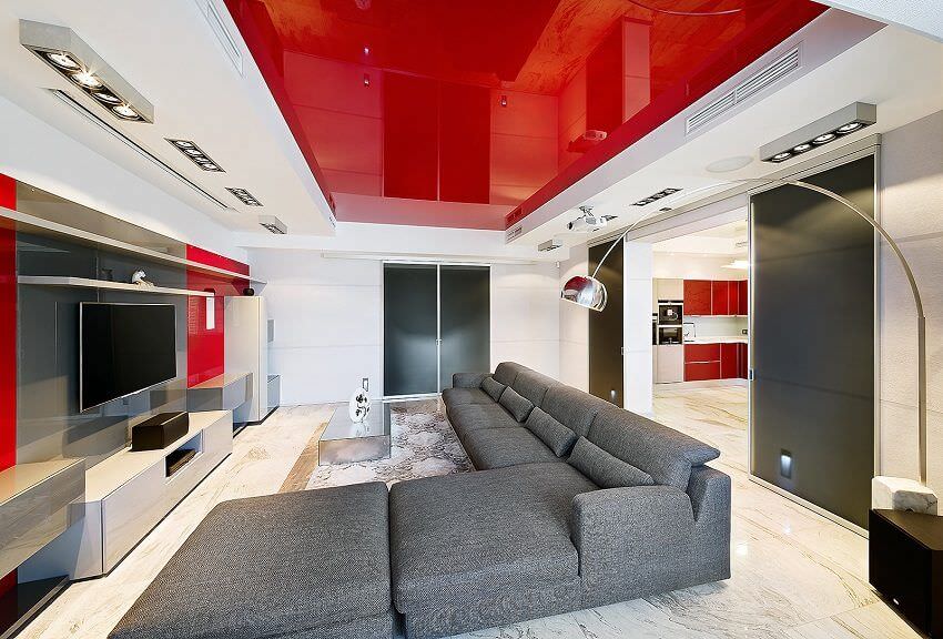 The hall is a place for relaxation, meeting with friends and family. The interior can be unusual, complex and even creative. A simple and elegant finish would be a pearl white stretch ceiling.A multi-tiered plasterboard structure or a canvas with a noticeable texture looks more original. Depending on the selected style, the surface can be matte or glossy, and the illumination can be spotted or diffused or central.