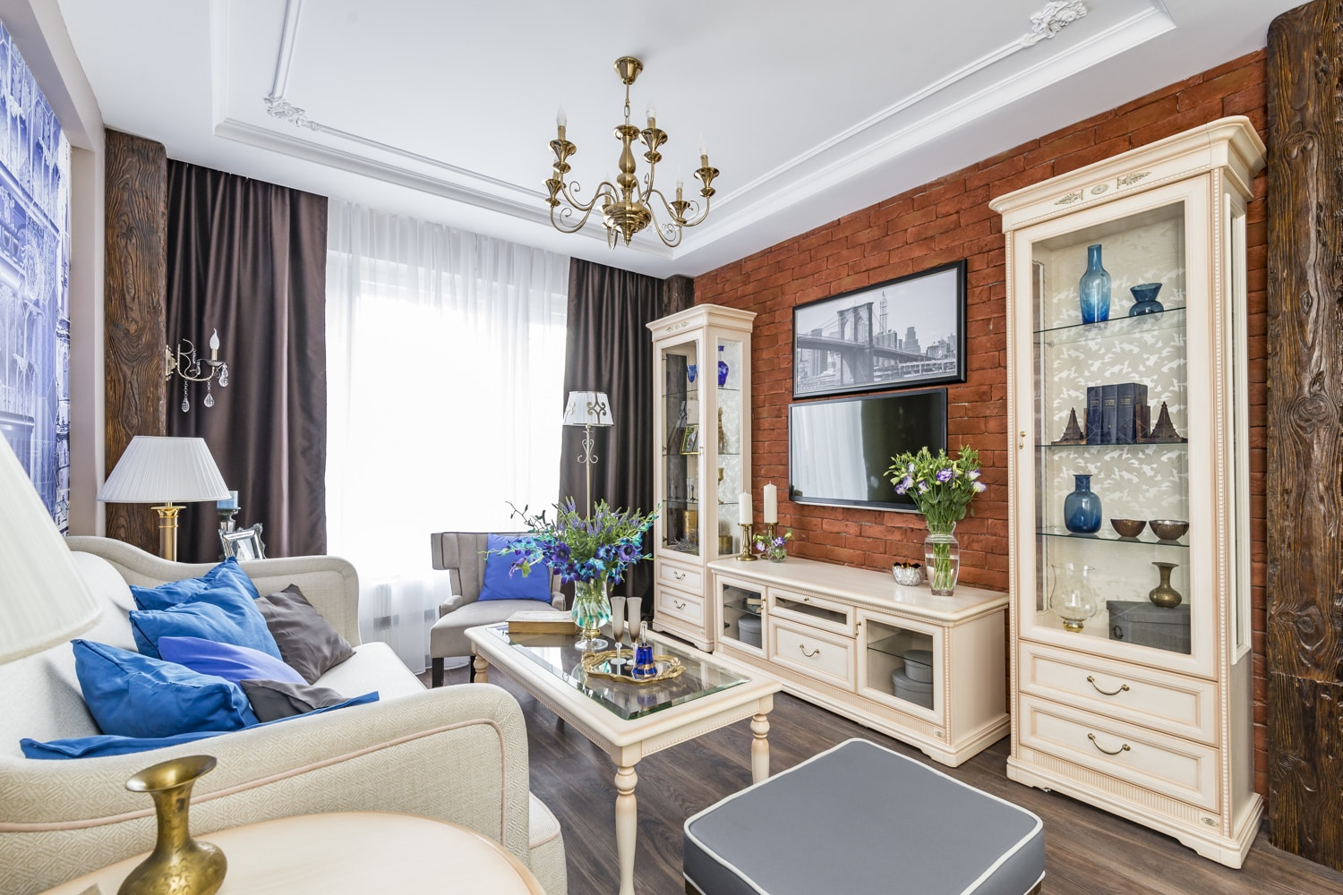 You can save the height of the room by using painting or wallpapering, linear lamps or a stylized chandelier will continue the design idea. In spacious environments, you can use bleached wood or painted brick.