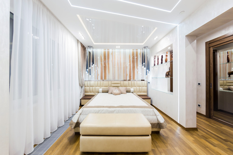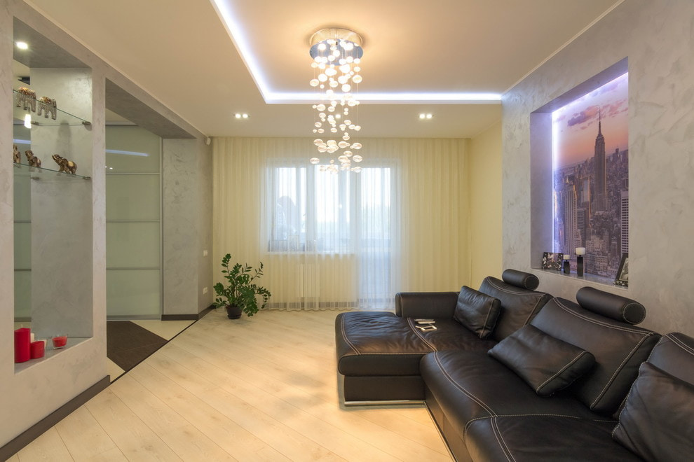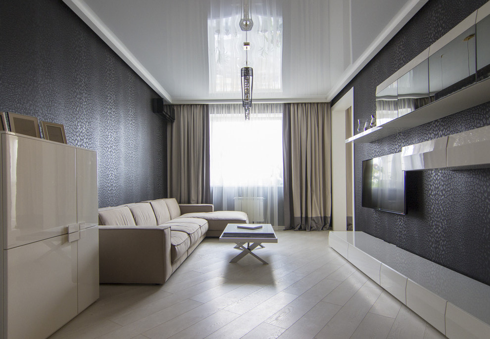 In modern design, a structure of a complex non-standard shape or from several tiers will be appropriate. For stylish hi-tech or minimalism, an even single-level glossy or matte ceiling is more than enough.