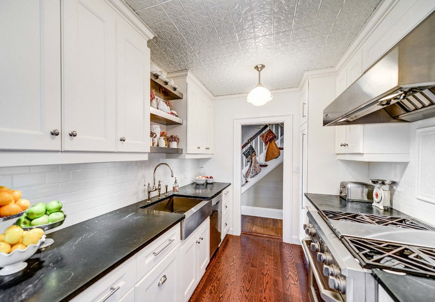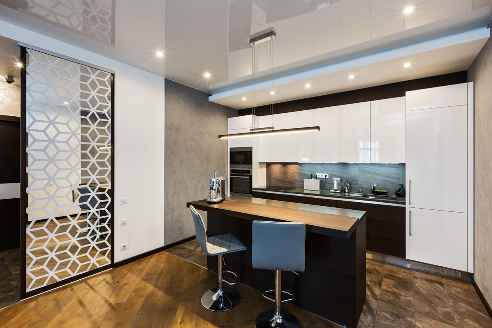 In a kitchen with a small area, a glossy ceiling would be the best idea for finishing; due to the mirror properties, the kitchen will seem more spacious. A matte surface, a two-tier structure or a rack-type ceiling looks no less impressive.