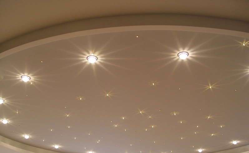 Suitable for decorating spacious halls or bedrooms. The structure is made of plasterboard with PVC inserts, stained glass and other materials.