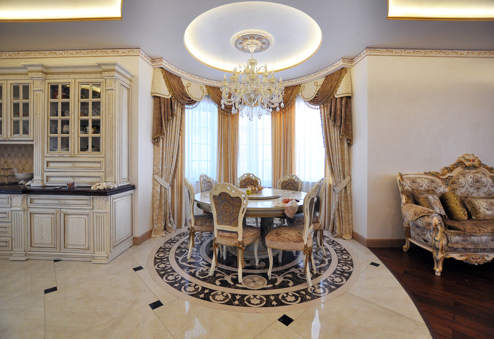 The ceiling can be one or more tiers, the use of gloss and sparkles is excluded. Ceiling stucco molding and curly skirting boards look aesthetically pleasing as a decor.
