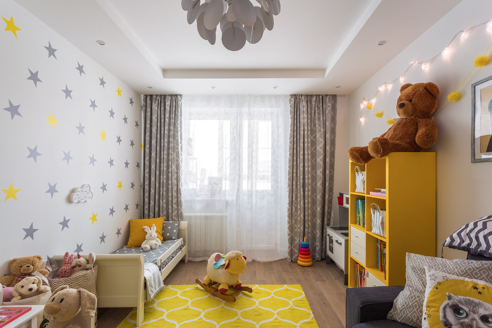 In the nursery, you can use multi-level lighting, unusual structures and photo printing. It is important to use pleasant, non-irritating shades that will blend in with the rest of the finish.