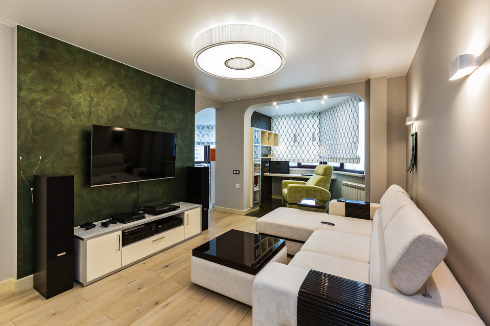 On the picture compact living room with natural motives. The walls and ceilings are finished with plasterboard multi-level structures.