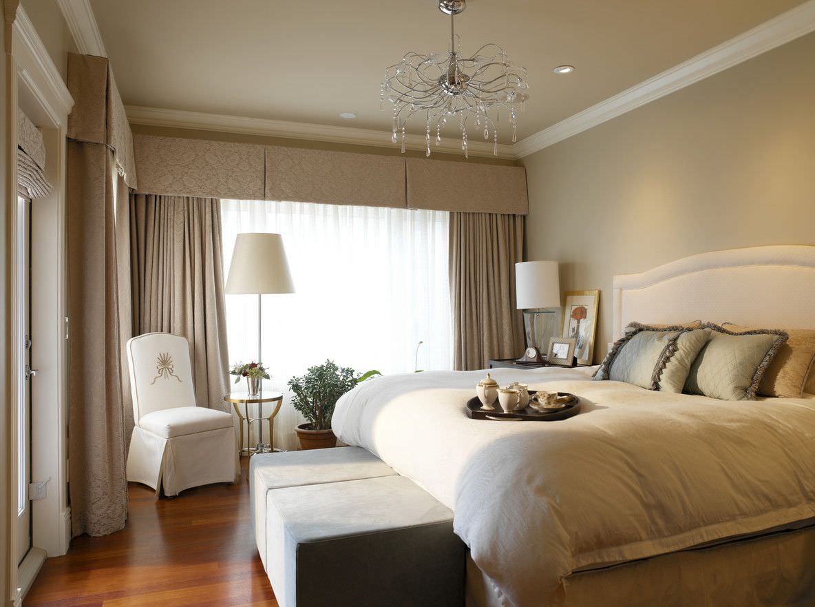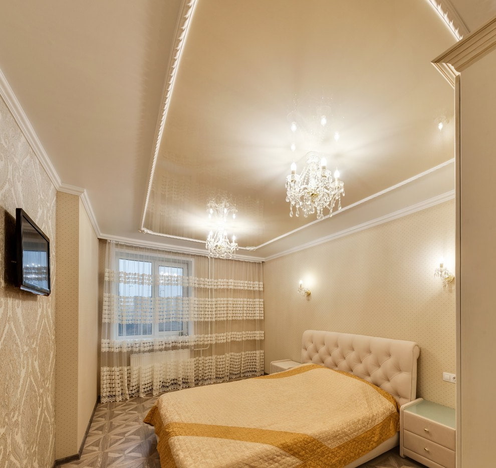 Warm shades are great for the bedroom, the interior envelops with warmth and soft light. To decorate a classic bedroom, the ceiling can be matte with an unusual chandelier or multi-tiered satin. The modern interior will be decorated with a beige ceiling combined with dark furniture.